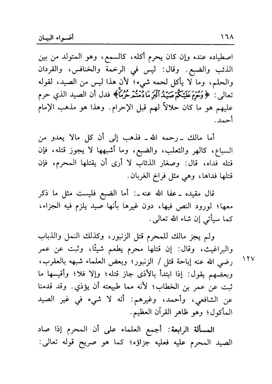 اصطياده عنده وإن كان يحرم أكله، كالسمع، وهو المتولد من بين الذئب والضبع. وقال: ليس في الرخمة والخنافس، والقردان والحلم، وما لا يأكل لحمه شيء؛ لأن هذا ليس من الصيد، لقوله تعالى: {وَحُرِّمَ عَلَيْكُمْ صَيْدُ الْبَرِّ مَا دُمْتُمْ حُرُماً} فدل أن الصيد الذي حرم عليهم هو ما كان حلالاً لهم قبل الإحرام. وهذا هو مذهب الإمام أحمد.