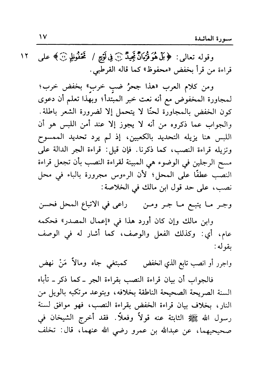 ومن كلام العرب "هذا جحر ضب خرب" بخفض خرب؛ لمجاورة المخفوض مع أنه نعت خبر المبتدأ؛ وبهذا تعلم أن دعوى كون الخفض بالمجاورة لحناً لا يتحمل إلا لضرورة الشعر باطلة. والجواب عما ذكروه من أنه لا يجوز إلا عند أمن اللبس هو أن اللبس هنا يزيله التحديد بالكعبين، إذ لم يرد تحديد الممسوح وتزيله قراءة النصب، كما ذكرنا. فإن قيل: قراءة الجر الدالة على مسح الرجلين في الوضوء هي المبينة لقراءة النصب بأن تجعل قراءة النصب عطفاً على المحل؛ لأن الرءوس مجرورة بالباء في محل نصب، على حد قول ابن مالك في الخلاصة: