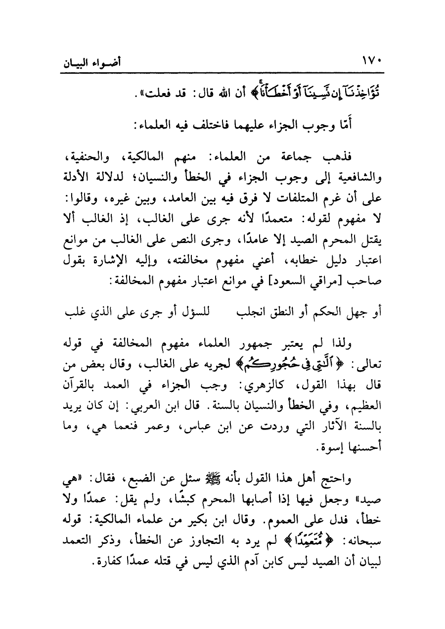ولذا لم يعتبر جمهور العلماء مفهوم المخالفة في قوله تعالى: {اللَّاتِي فِي حُجُورِكُمْ} لجريه على الغالب، وقال بعض من قال بهذا القول، كالزهري: وجب الجزاء في العمد بالقرآن العظيم، وفي الخطأ والنسيان بالسنة. قال ابن العربي: إن كان يريد بالسنة الآثار التي وردت عن ابن عباس، وعمر فنعما هي، وما أحسنها إسوة.