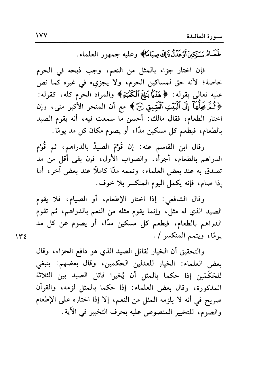 والتحقيق أن الخيار لقاتل الصيد الذي هو دافع الجزاء، وقال بعض العلماء: الخيار للعدلين الحكمين، وقال بعضهم: ينبغي للحَكَمَين إذا حكما بالمثل أن يخيرا قاتل الصيد بين الثلاثة المذكورة، وقال بعض العلماء: إذا حكما بالمثل لزمه، والقرآن صريح في أنه لا يلزمه المثل من النعم، إلا إذا اختاره على الإطعام والصوم، للتخيير المنصوص عليه بحرف التخيير في الآية.