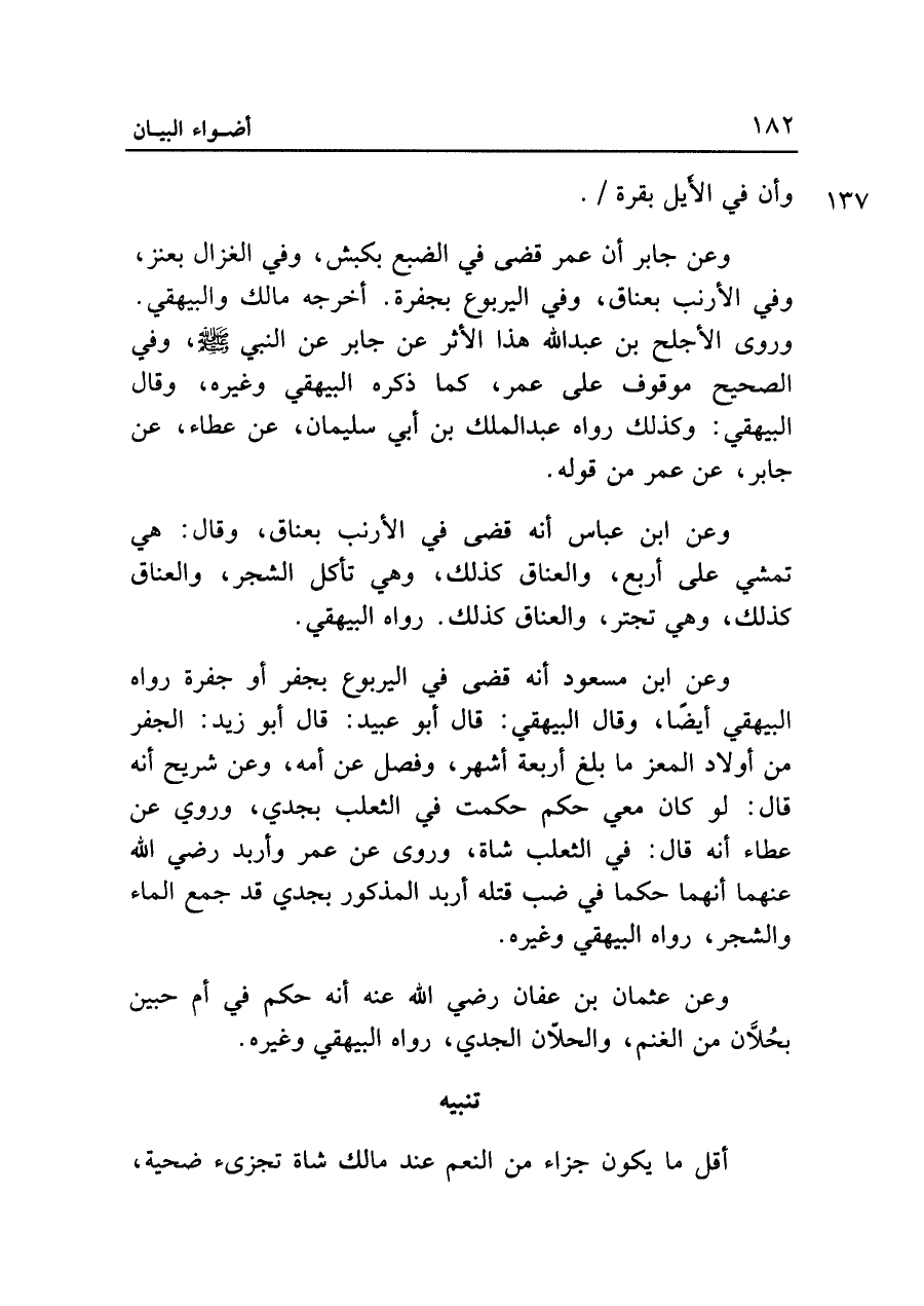 وعن ابن مسعود أنه قضى في اليربوع بجفر أو جفرة رواه البيهقي أيضاً، وقال البيهقي: قال أبو عبيد: قال أبو زيد: الجفر من أولاد المعز ما بلغ أربعة أشهر، وفصل عن أمه، وعن شريح أنه قال: لو كان معي حكم حكمت في الثعلب بجدي، وروي عن عطاء أنه قال: في الثعلب شاة، وروي عن عمر وأربد رضي الله عنهما أنهما حكما في ضب قتله أربد المذكور بجدي قد جمع الماء والشجر، رواه البيهقي وغيره.