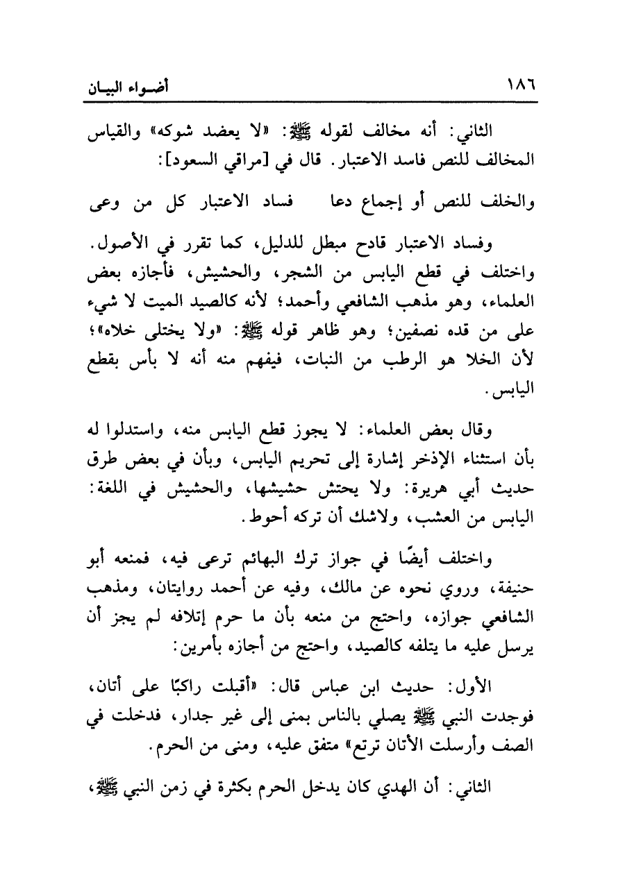 الثاني: أنه مخالف لقوله - صلى الله عليه وسلم -: "لا يعضد شوكه" والقياس المخالف للنص فاسد الاعتبار. قال في [مراقي السعود]:
