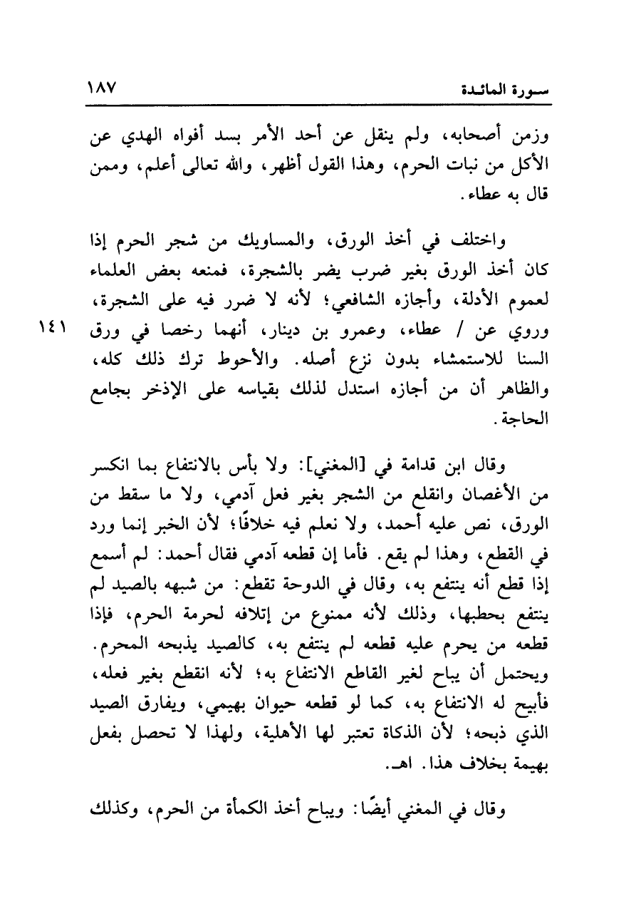 وقال ابن قدامة في [المغني]: ولا بأس بالانتفاع بما انكسر من الأغصان وانقلع من الشجر بغير فعل آدمي، ولا ما سقط من الورق، نص عليه أحمد، ولا نعلم فيه خلافاً؛ لأن الخبر إنما ورد في القطع، وهذا لم يقع. فأما إن قطعه آدمي فقال أحمد: لم أسمع إذا قطع أنه ينتفع به، وقال في الدوحة تقطع: من شبهه بالصيد لم ينتفع بحطبها، وذلك لأنه ممنوع من اتلافه لحرمة الحرم، فإذا قطعه من يحرم عليه قطعه لم ينتفع به، كالصيد يذبحه المحرم. ويحتمل أن يباح لغير القاطع الانتفاع به، لأنه انقطع بغير فعله، فأبيح له الانتفاع به، كما لو قطعه حيوان بهيمي، ويفارق الصيد الذي ذبحه؛ لأن الذكاة تعتبر لها الأهلية، ولهذا لا تحصل بفعل بهيمة بخلاف هذا. اهـ.