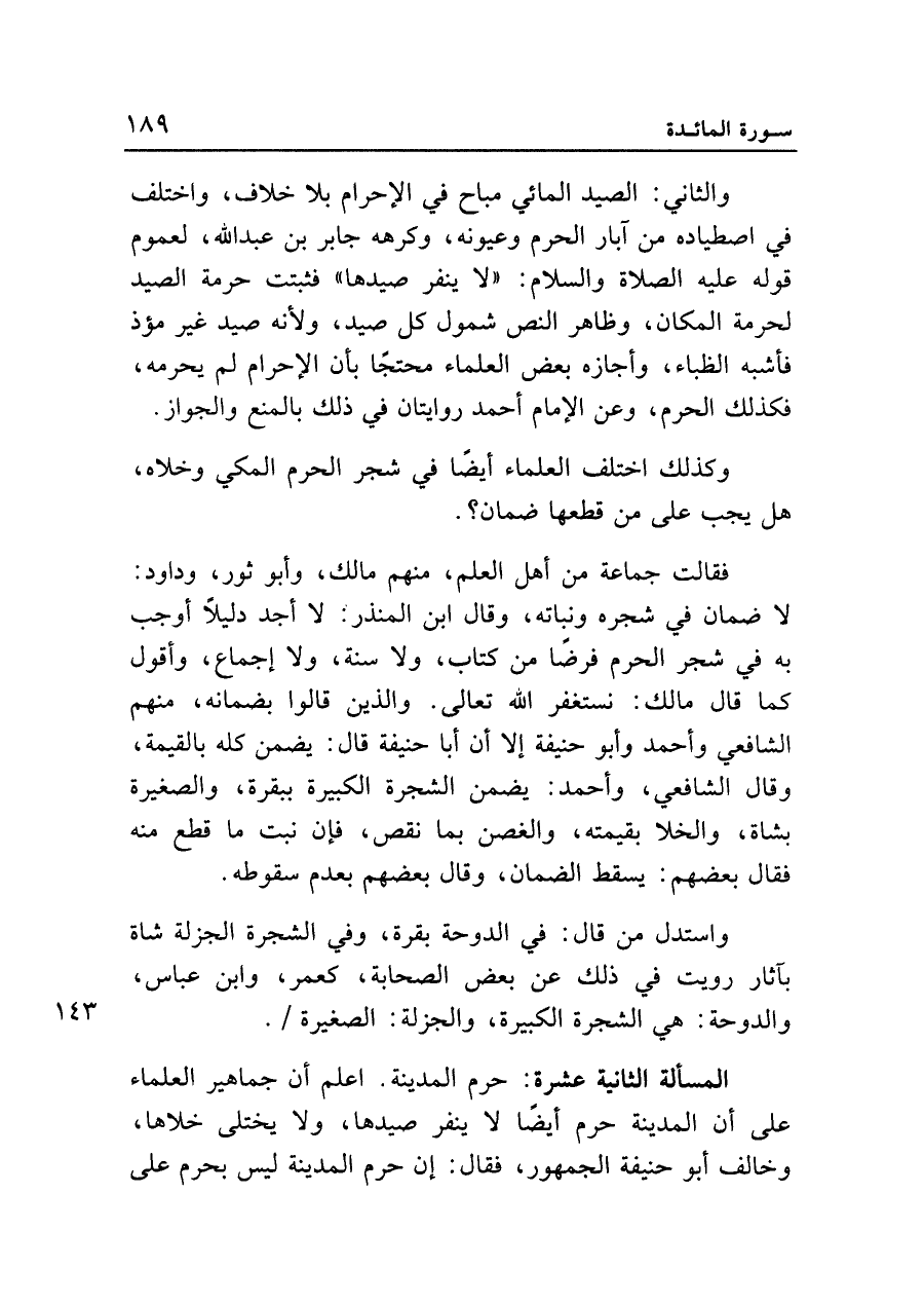 المسألة الثانية عشرة: حرم المدينة. اعلم أن جماهير العلماء على أن المدينة حرم أيضاً لا ينفر صيدها، ولا يختلى خلاها، وخالف أبو حنيفة الجمهور، فقال: إن حرم المدينة ليس بحرم على