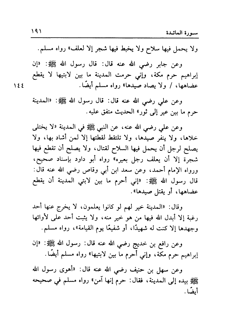 وعن علي رضي الله عنه، عن النبي - صلى الله عليه وسلم - في المدينة "لا يختلى خلاها، ولا ينفر صيدها، ولا تلتقط لقطتها إلا لمن أشاد بها، ولا يصلح لرجل أن يحمل فيها السلاح لقتال، ولا يصلح أن تقطع فيها شجرة إلا أن يعلف رجل بعيره" رواه أبو داود بإسناد صحيح، ورواه الإمام أحمد، وعن سعد ابن أبي وقاص رضي الله عنه قال: قال رسول الله - صلى الله عليه وسلم -: "إني أحرم ما بين لابتي المدينة أن يقطع عضاهها، أو يقتل صيدها".
