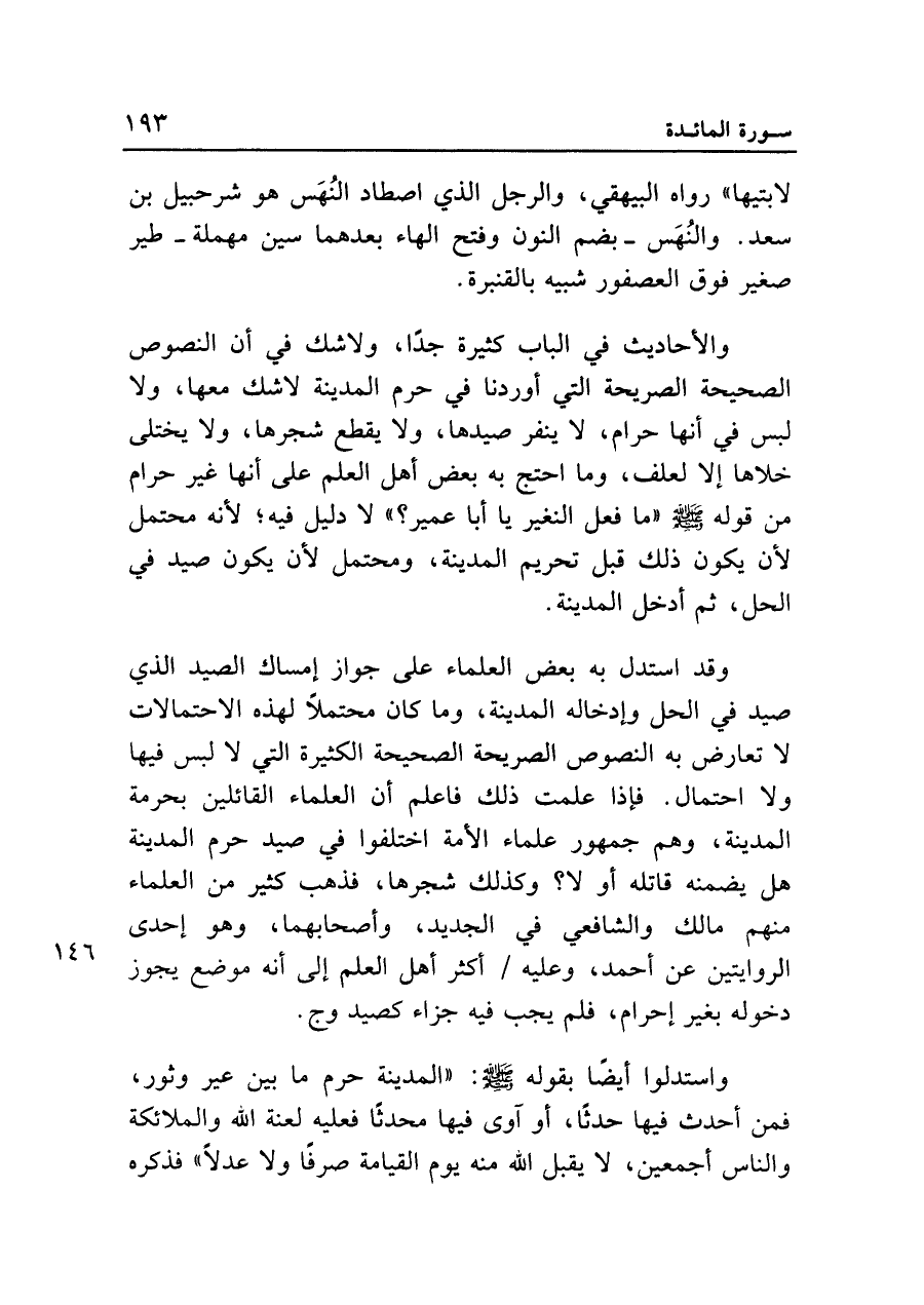 لابتيها" رواه البيهقي، والرجل الذي اصطاد النهس هو شرحبيل بن سعد. والنُهَس -بضم النون وفتح الهاء بعدهما سين مهملة- طير صغير فوق العصفور شبيه بالقنبرة.