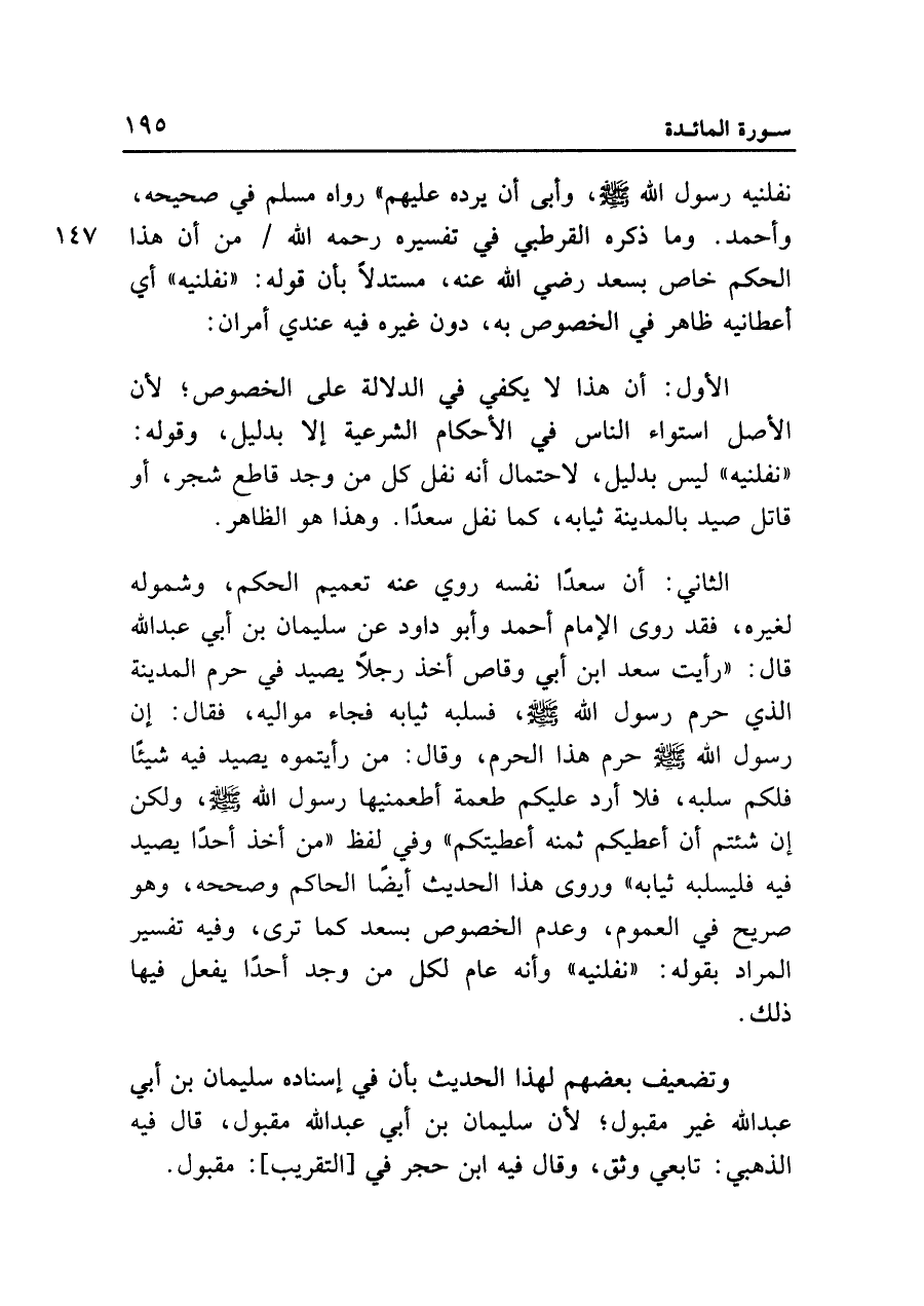 الثاني: أن سعداً نفسه روي عنه تعميم الحكم، وشموله لغيره، فقد روى الإمام أحمد وأبو داود عن سليمان بن أبي عبد الله قال: "رأيت سعد ابن أبي وقاص أخذ رجلاً يصيد في حرم المدينة الذي حرم رسول الله - صلى الله عليه وسلم -، فسلبه ثيابه فجاء مواليه، فقال: إن رسول الله - صلى الله عليه وسلم - حرم هذا الحرم، وقال: من رأيتموه يصيد فيه شيئاً فلكم سلبه، فلا أرد عليكم طعمة أطعمنيها رسول الله - صلى الله عليه وسلم -، ولكن إن شئتم أن أعطيكم ثمنه أعطيتكم" وفي لفظ "من أخذ أحداً يصيد فيه فليسلبه ثيابه" وروى هذا الحديث أيضاً الحاكم وصححه، وهو صريح في العموم، وعدم الخصوص بسعد كما ترى، وفيه تفسير المراد بقوله: "نفلنيه" وأنه عام لكل من وجد أحداً يفعل فيها ذلك.