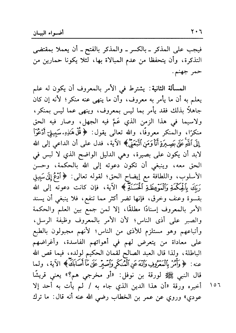 المسألة الثانية: يشترط في الآمر بالمعروف أن يكون له علم يعلم به أن ما يأمر به معروف، وأن ما ينهى عنه منكر؛ لأنه إن كان جاهلاً بذلك فقد يأمر بما ليس بمعروف، وينهي عما ليس بمنكر، ولا سيما في هذا الزمن الذي عم فيه الجهل، وصار فيه الحق منكراً، والمنكر معروفاً، والله تعالى يقول: {قُلْ هَذِهِ سَبِيلِي أَدْعُو إِلَى اللَّهِ عَلَى بَصِيرَةٍ أَنَا وَمَنِ اتَّبَعَنِي} الآية، فدل على أن الداعي إلى الله لا بد أن يكون على بصيرة، وهي الدليل الواضح الذي لا لبس في الحق معه، وينبغي أن تكون دعوته إلى الله بالحكمة، وحسن الأسلوب، واللطافة مع إيضاح الحق؛ لقوله تعالى: {ادْعُ إِلَى سَبِيلِ رَبِّكَ بِالْحِكْمَةِ وَالْمَوْعِظَةِ الْحَسَنَةِ} الآية، فإن كانت دعوته إلى الله بقسوة وعنف وخرق، فإنها تضر أكثر مما تنفع، فلا ينبغي أن يسند الأمر بالمعروف إسناداً مطلقاً، إلا لمن جمع بين العلم والحكمة والصبر على أذى الناس؛ لأن الأمر بالمعروف وظيفة الرسل، وأتباعهم وهو مستلزم للأذى من الناس؛ لأنهم مجبولون بالطبع على معاداة من يتعرض لهم في أهوائهم الفاسدة، وأغراضهم الباطلة، ولذا قال العبد الصالح لقمان الحكيم لولده، فيما قص الله عنه: {وَأْمُرْ بِالْمَعْرُوفِ وَانْهَ عَنِ الْمُنْكَرِ وَاصْبِرْ عَلَى مَا أَصَابَكَ} الآية، ولما قال النبي - صلى الله عليه وسلم - لورقة بن نوفل: "أو مخرجي هم؟ " يعني قريشاً أخبره ورقة "أن هذا الدين الذي جاء به لم يأت به أحد إلا عودي" وروي عن عمر بن الخطاب رضي الله عنه أنه قال: ما ترك