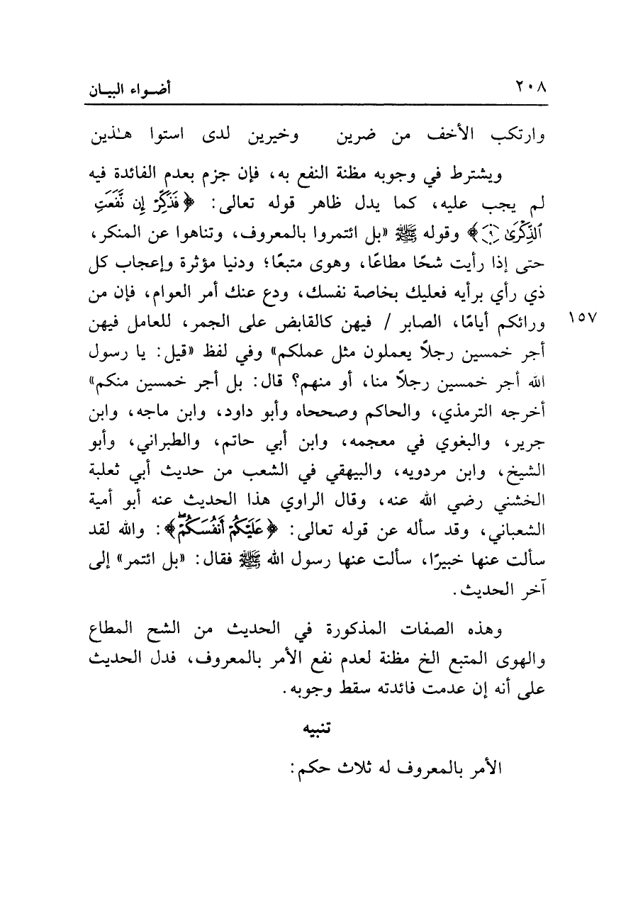 ويشترط في وجوبه مظنة النفع به، فإن جزم بعدم الفائدة فيه لم يجب عليه، كما يدل ظاهر قوله تعالى: {فَذَكِّرْ إِنْ نَفَعَتِ الذِّكْرَى (٩)} وقوله - صلى الله عليه وسلم - "بل ائتمروا بالمعروف، وتناهوا عن المنكر، حتى إذا رأيت شحاً مطاعاً، وهوى متبعا؛ ودنيا مؤثرة وإعجاب كل ذي رأي برأيه فعليك بخاصة نفسك، ودع عنك أمر العوام، فإن من ورائكم أياماً، الصابر فيهن كالقابض على الجمر، للعامل فيهن أجر خمسين رجلاً يعملون مثل عملكم" وفي لفظ "قيل: يا رسول الله أجر خمسين رجلاً منا، أو منهم؟ قال: بل أجر خمسين منكم" أخرجه الترمذي، والحاكم وصححاه وأبو داود، وابن ماجه، وابن جرير، والبغوي في معجمه، وابن أبي حاتم، والطبراني، وأبو الشيخ، وابن مردويه، والبيهقي في الشعب من حديث أبي ثعلبة الخشني رضي الله عنه، وقال الراوي هذا الحديث عنه أبو أمية الشعباني، وقد سأله عن قوله تعالى: {عَلَيْكُمْ أَنْفُسَكُمْ}: والله لقد سألت عنها خبيراً، سألت عنها رسول الله - صلى الله عليه وسلم - فقال: "بل ائتمر" إلى آخر الحديث.