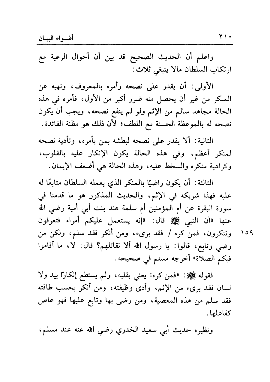الثالثة: أن يكون راضياً بالمنكر الذي يعمله السلطان متابعاً له عليه فهذا شريكه في الإثم، والحديث المذكور هو ما قدمنا في سورة البقرة عن أم المؤمنين أم سلمة هند بنت أبي أمية رضي الله عنها "أن النبي - صلى الله عليه وسلم - قال: "إنه يستعمل عليكم أمراء فتعرفون وتنكرون، فمن كره فقد برىء، ومن أنكر فقد سلم، ولكن من رضي وتابع، قالوا: يا رسول الله ألا نقاتلهم؟ قال: لا، ما أقاموا فيكم الصلاة" أخرجه مسلم في صحيحه.