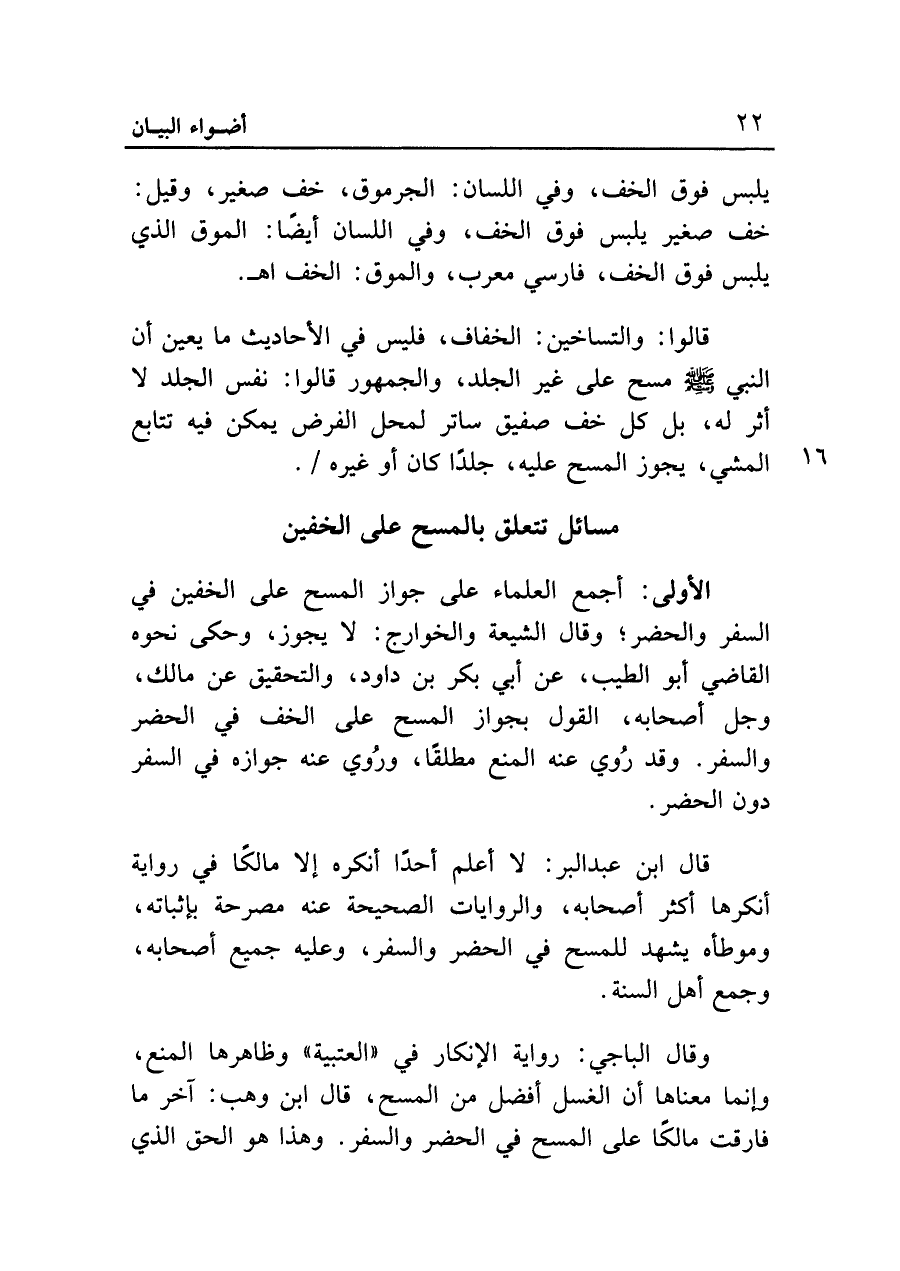 الأولى: أجمع العلماء على جواز المسح على الخفين في السفر والحضر؛ وقال الشيعة والخوارج: لا يجوز، وحكي نحوه القاضي أبو الطيب، عن أبي بكر بن داود، والتحقيق عن مالك، وجل أصحابه، القول بجواز المسح على الخف في الحضر والسفر. وقد روي عنه المنع مطلقاً، وروي عنه جوازه في السفر دون الحضر.