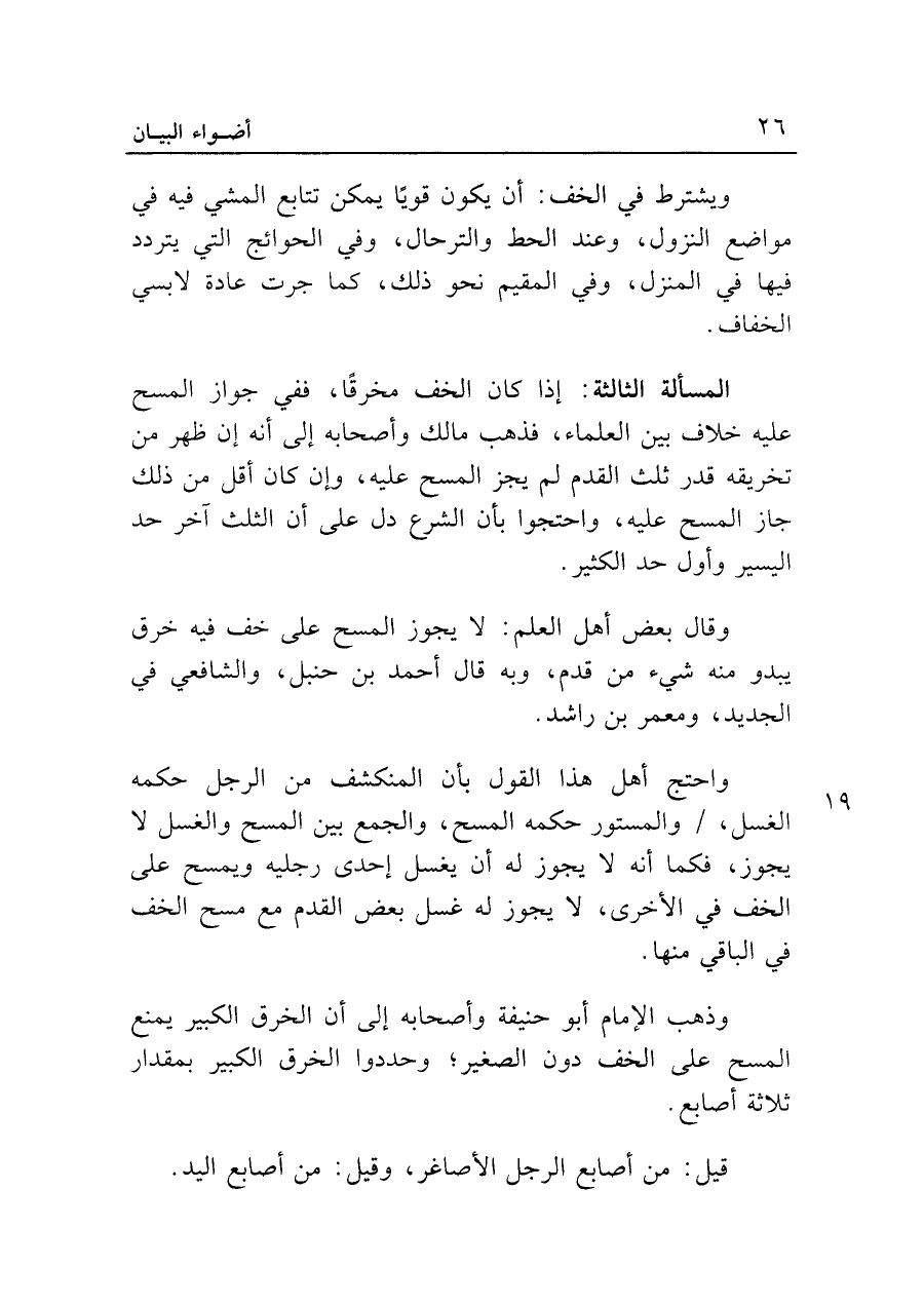 المسألة الثالثة: إذا كان الخف مخرقاً، ففي جواز المسح عليه خلاف بين العلماء، فذهب مالك وأصحابه إلى أنه إن ظهر من تخريقه قدر ثلث القدم لم يجز المسح عليه، وإن كان أقل من ذلك جاز المسح عليه، واحتجوا بأن الشرع دل على أن الثلث آخر حد اليسير وأول حد الكثير.