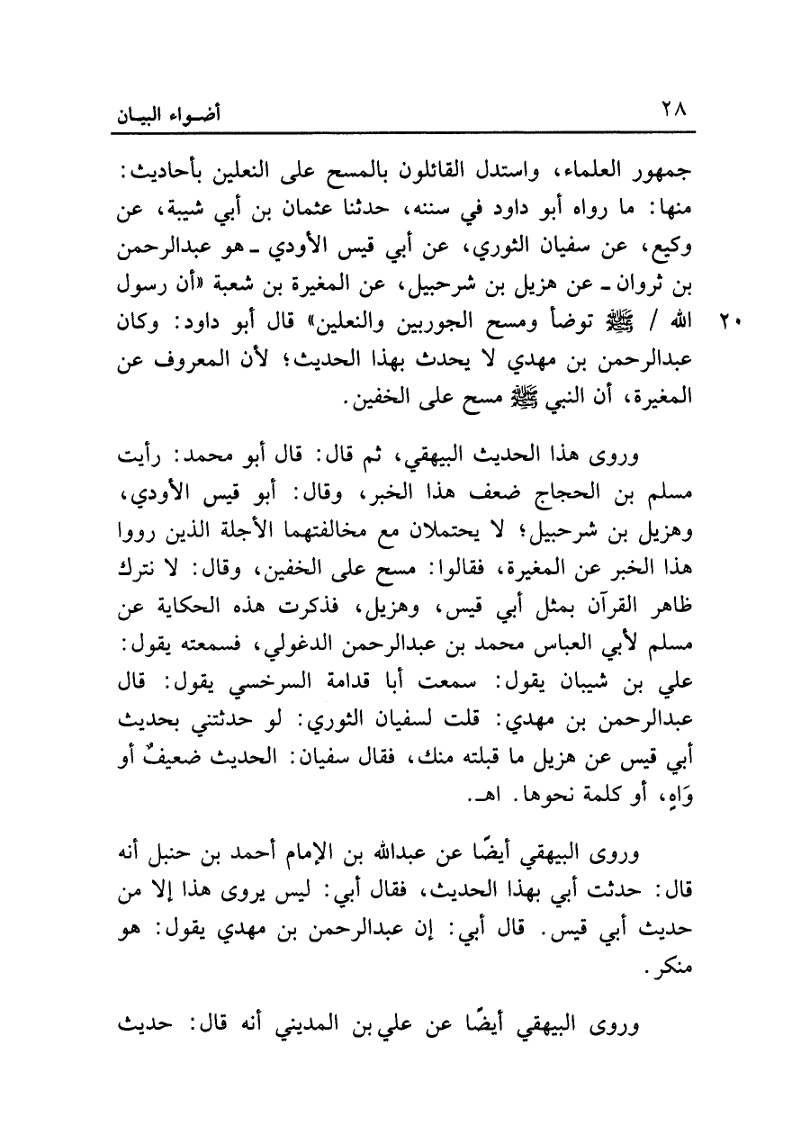 جمهور العلماء، واستدل القائلون بالمسح على النعلين بأحاديث: منها: ما رواه أبو داود في سننه، حدثنا عثمان بن أبي شيبة، عن وكيع، عن سفيان الثوري، عن أبي قيس الأودي -هو عبد الرحمن بن ثروان- عن هزيل بن شرحبيل، عن المغيرة بن شعبة "أن رسول الله - صلى الله عليه وسلم - توضأ ومسح الجوربين والنعلين" قال أبو داود: وكان عبد الرحمن بن مهدي لا يحدث بهذا الحديث؛ لأن المعروف عن المغيرة، أن النبي - صلى الله عليه وسلم - مسح على الخفين.