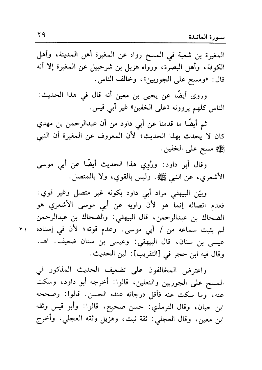 ثم أيضاً ما قدمنا عن أبي داود من أن عبد الرحمن بن مهدي كان لا يحدث بهذا الحديث؛ لأن المعروف عن المغيرة أن النبي - صلى الله عليه وسلم - مسح على الخفين.