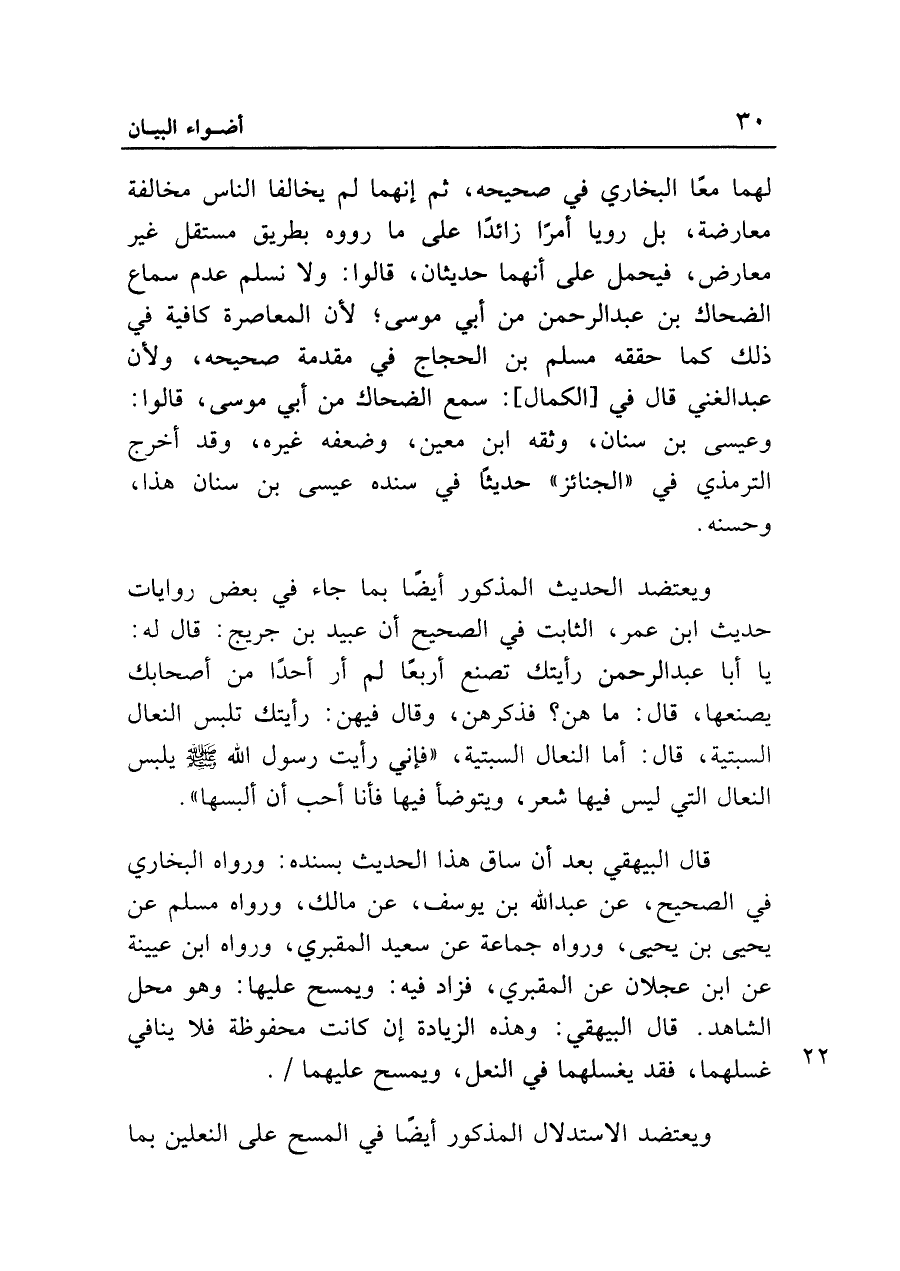 قال البيهقي بعد أن ساق هذا الحديث بسنده: ورواه البخاري في الصحيح، عن عبد الله بن يوسف، عن مالك، ورواه مسلم عن يحيى بن يحيى، ورواه جماعة عن سعيد المقبري، ورواه ابن عيينة عن ابن عجلان عن المقبري، فزاد فيه: ويمسح عليها: وهو محل الشاهد. قال البيهقي: وهذه الزيادة إن كانت محفوظة فلا ينافي غسلهما، فقد يغسلهما في النعل، ويمسح عليهما.