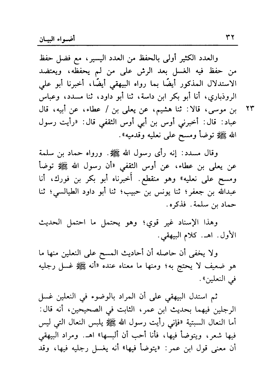 والعدد الكثير أولى بالحفظ من العدد اليسير، مع فضل حفظ من حفظ فيه الغسل بعد الرش على من لم يحفظه، ويعتضد الاستدلال المذكور أيضاً بما رواه البيهقي أيضاً، أخبرنا أبو علي الروذباري، أنا أبو بكر ابن داسة، ثنا أبو داود، ثنا مسدد، وعباس بن موسى، قالا: ثنا هشيم، عن يعلى بن عطاء، عن أبيه، قال عباد: قال: أخبرني أوس بن أبي أوس الثقفي قال: "رأيت رسول الله - صلى الله عليه وسلم - توضأ ومسح على نعليه وقدميه".