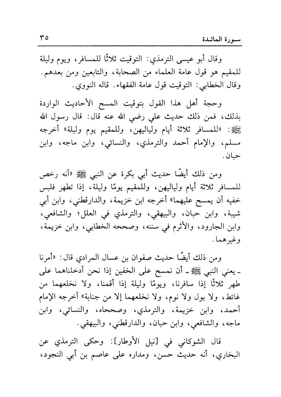 ومن ذلك أيضاً حديث صفوان بن عسال المرادي قال: "أمرنا -يعني النبي - صلى الله عليه وسلم - أن نمسح على الخفين إذا نحن أدخلناهما على طهر ثلاثاً إذا سافرنا، ويوماً وليلة إذا أقمنا، ولا نخلعهما من غائط، ولا بول ولا نوم، ولا نخلعهما إلا من جنابة" أخرجه الإمام أحمد، وابن خزيمة، والترمذي، وصححاه، والنسائي، وابن ماجه، والشافعي، وابن حبان، والدارقطني، والبيهقي.