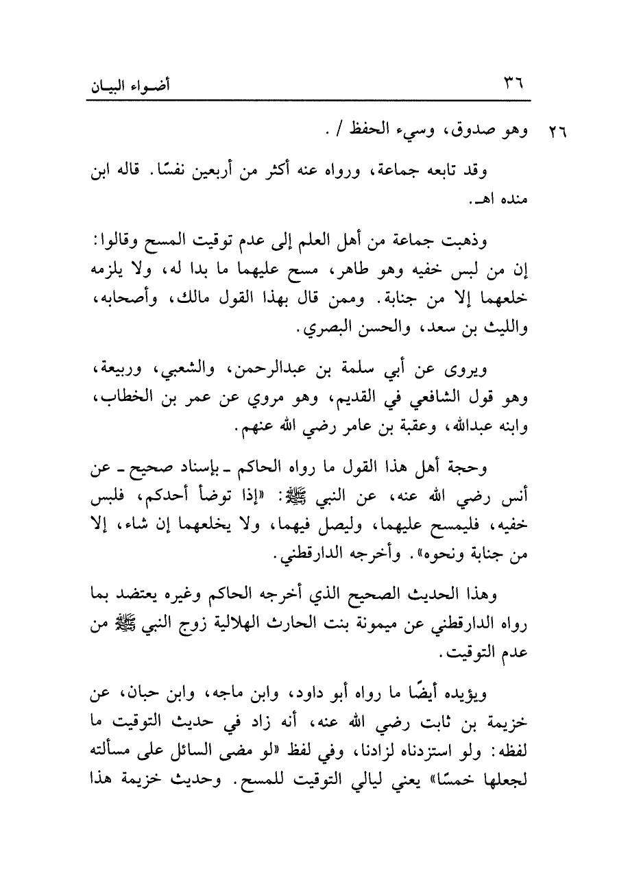 ويؤيده أيضاً ما رواه أبو داود، وابن ماجه، وابن حبان، عن خزيمة بن ثابت رضي الله عنه، أنه زاد في حديث التوقيت ما لفظه: ولو استزدناه لزادنا، وفي لفظ "لو مضى السائل على مسألته لجعلها خمساً" يعني ليالي التوقيت للمسح. وحديث خزيمة هذا