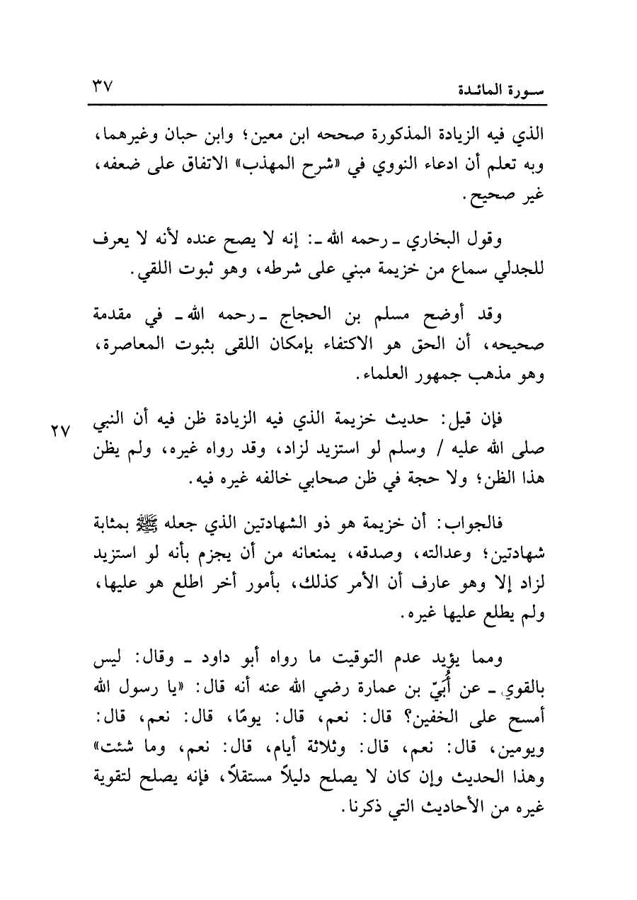 ومما يؤيد عدم التوقيت ما رواه أبو داود -وقال: ليس بالقوي- عن أبي بن عمارة رضي الله عنه أنه قال: "يا رسول الله أمسح على الخفين؟ قال: نعم، قال: يوماً، قال: نعم، قال: ويومين، قال: نعم، قال: وثلاثة أيام، قال: نعم، وما شئت" وهذا الحديث وإن كان لا يصلح دليلا مستقلاً، فإنه يصلح لتقوية غيره من الأحاديث التي ذكرنا.