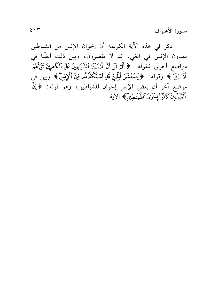 ذكر في هذه الآية الكريمة أن إخوان الإنس من الشياطين يمدون الإنس في الغي، ثم لا يقصرون، وبين ذلك أيضاً في مواضع أخرى كقوله: {أَلَمْ تَرَ أَنَّا أَرْسَلْنَا الشَّيَاطِينَ عَلَى الْكَافِرِينَ تَؤُزُّهُمْ أَزّاً (٨٣)} وقوله: {يَامَعْشَرَ الْجِنِّ قَدِ اسْتَكْثَرْتُمْ مِنَ الْأِنْسِ} وبين في موضع آخر أن بعض الإنس إخوان للشياطين، وهو قوله: {إِنَّ الْمُبَذِّرِينَ كَانُوا إِخْوَانَ الشَّيَاطِينِ} الآية.