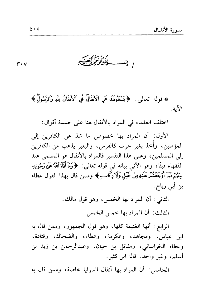 اختلف العلماء في المراد بالأنفال هنا على خمسة أقوال: