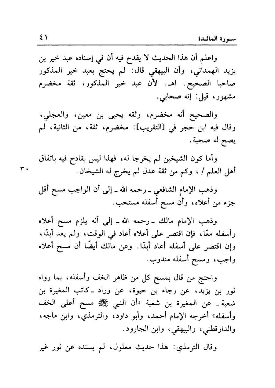 واعلم أن هذا الحديث لا يقدح فيه أن في إسناده عبد خير بن يزيد الهمداني، وأن البيهقي قال: لم يحتج بعبد خير المذكور صاحبا الصحيح. اهـ. لأن عبد خير المذكور، ثقة مخضرم مشهور، قيل: إنه صحابي.