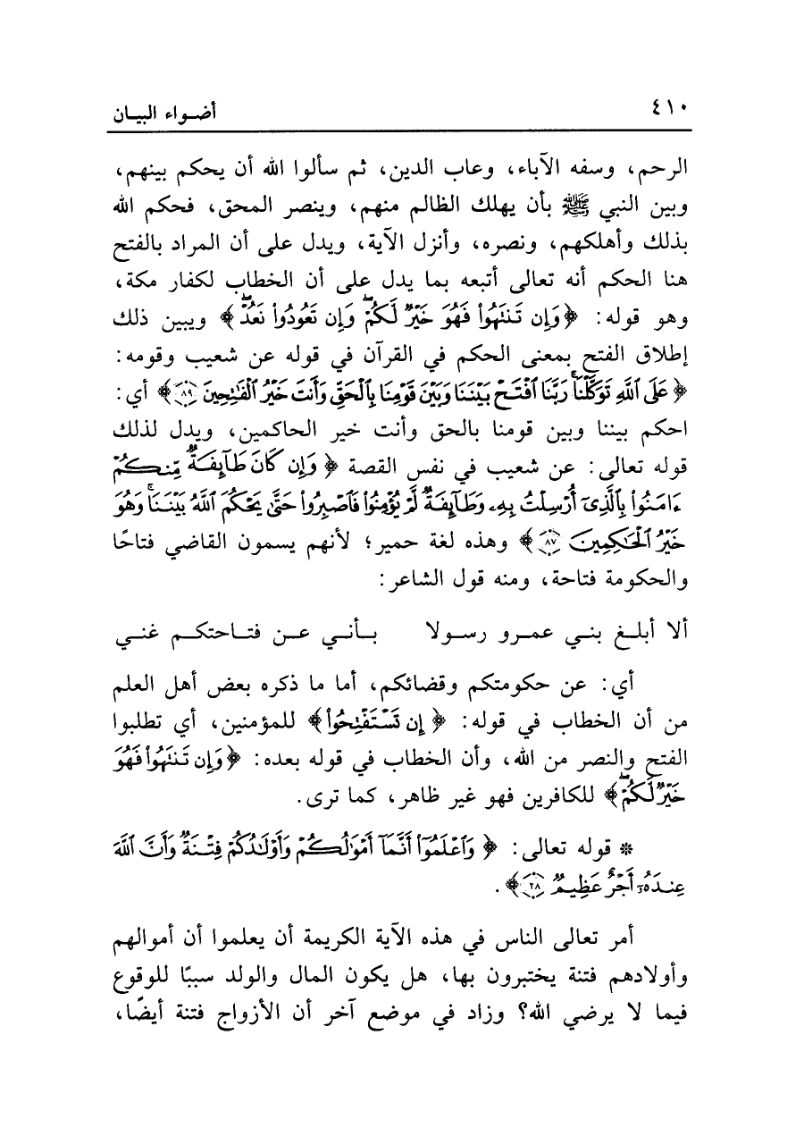 الرحم، وسفه الآباء، وعاب الدين، ثم سألوا الله أن يحكم بينهم، وبين النَّبي - صلى الله عليه وسلم - بأن يهلك الظالم منهم، وينصر المحق، فحكم الله بذلك وأهلكهم، ونصره، وأنزل الآية، ويدل على أن المراد بالفتح هنا الحكم أنه تعالى أتبعه بما يدل على أن الخطاب لكفار مكة، وهو قوله: {وَإِنْ تَنْتَهُوا فَهُوَ خَيْرٌ لَكُمْ وَإِنْ تَعُودُوا نَعُدْ} ويبين ذلك إطلاق الفتح بمعنى الحكم في القرآن في قوله عن شعيب وقومه: {عَلَى اللَّهِ تَوَكَّلْنَا رَبَّنَا افْتَحْ بَيْنَنَا وَبَيْنَ قَوْمِنَا بِالْحَقِّ وَأَنْتَ خَيْرُ الْفَاتِحِينَ (٨٩)} أي: احكم بيننا وبين قومنا بالحق وأنت خير الحاكمين، ويدل لذلك قوله تعالى: عن شعيب في نفس القصة {وَإِنْ كَانَ طَائِفَةٌ مِنْكُمْ آمَنُوا بِالَّذِي أُرْسِلْتُ بِهِ وَطَائِفَةٌ لَمْ يُؤْمِنُوا فَاصْبِرُوا حَتَّى يَحْكُمَ اللَّهُ بَيْنَنَا وَهُوَ خَيْرُ الْحَاكِمِينَ (٨٧)} وهذه لغة حمير؛ لأنهم يسمون القاضي فتاحاً والحكومة فتاحة، ومنه قول الشاعر: