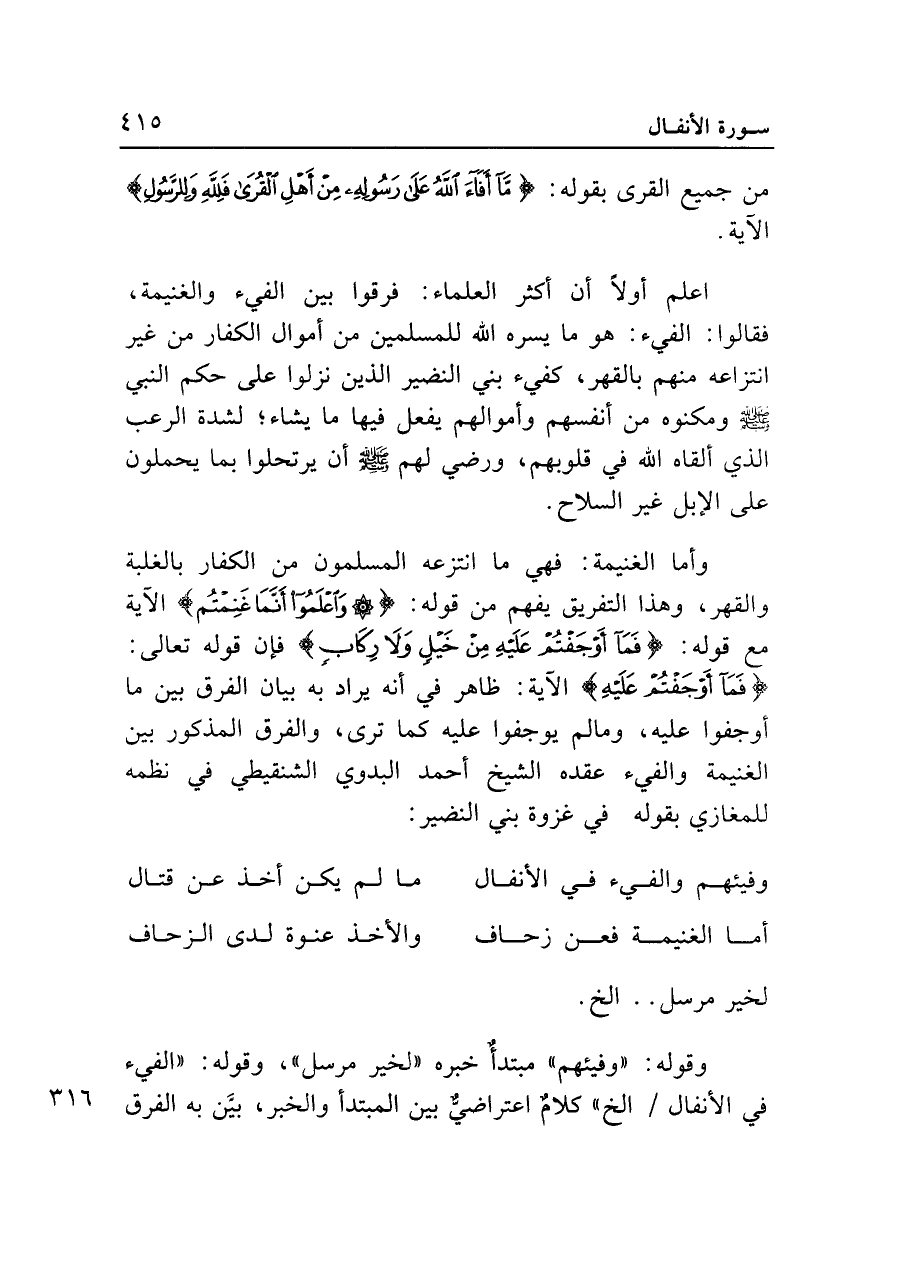 وأما الغنيمة: فهي ما انتزعه المسلمون من الكفار بالغلبة والقهر، وهذا التفريق يفهم من قوله: {وَاعْلَمُوا أَنَّمَا غَنِمْتُمْ} الآية مع قوله: {فَمَا أَوْجَفْتُمْ عَلَيْهِ مِنْ خَيْلٍ وَلا رِكَابٍ} فإن قوله تعالى: {فَمَا أَوْجَفْتُمْ عَلَيْهِ} الآية: ظاهر في أنه يراد به بيان الفرق بين ما أوجفوا عليه، وما لم يوجفوا عليه كما ترى، والفرق المذكور بين الغنيمة والفيء عقده الشيخ أحمد البدوي الشنقيطي في نظمه للمغازي بقوله في غزوة بني النضير: