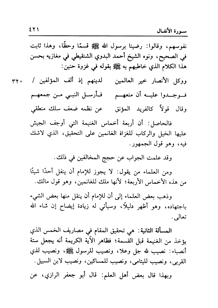 وذهب بعض العلماء إلى أن للإمام أن ينفل منها بعض الشيء باجتهاده، وهو أظهر دليلاً، وسيأتي له زيادة إيضاح إن شاء الله تعالى.
