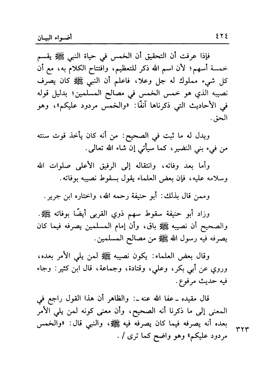 فإذا عرفت أن التحقيق أن الخمس في حياة النَّبي - صلى الله عليه وسلم - يقسم خمسة أسهم؛ لأن اسم الله ذكر للتعظيم، وافتتاح الكلام به، مع أن كل شيء مملوك له جل وعلا، فاعلم أن النَّبي - صلى الله عليه وسلم - كان يصرف نصيبه الذي هو خمس الخمس في مصالح المسلمين؛ بدليل قوله في الأحاديث التي ذكرناها آنفاً: "والخمس مردود عليكم"، وهو الحق.