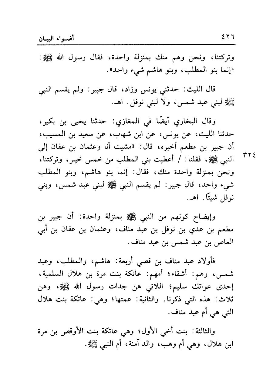 وقال البخاري أيضاً في المغازي: حدثنا يحيى بن بكير، حدثنا الليث، عن يونس، عن ابن شهاب، عن سعيد بن المسيب، أن جبير بن مطعم أخبره، قال: "مشيت أنا وعثمان بن عفان إلى النَّبي - صلى الله عليه وسلم -، فقلنا: أعطيت بني المطلب من خمس خيبر، وتركتنا، ونحن بمنزلة واحدة منك، فقال: إنما بنو هاشم، وبنو المطلب شيء واحد، قال جبير: لم يقسم النَّبي - صلى الله عليه وسلم - لبني عبد شمس، وبني نوفل شيئاً. اهـ.