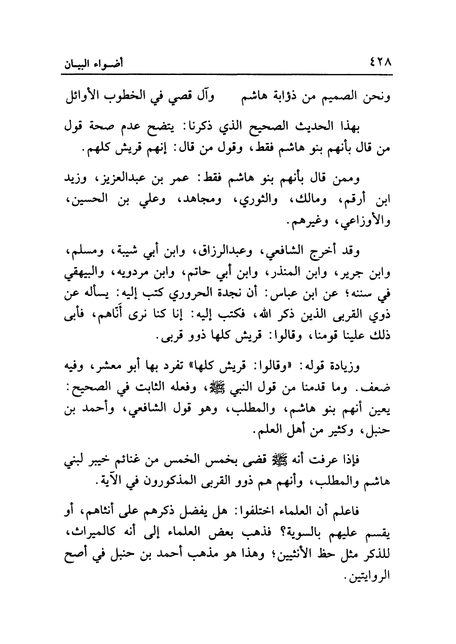 فإذا عرفت أنه - صلى الله عليه وسلم - قضى بخمس الخمس من غنائم خيبر لبني هاشم والمطلب، وأنهم هم ذوو القربى المذكورون في الآية.