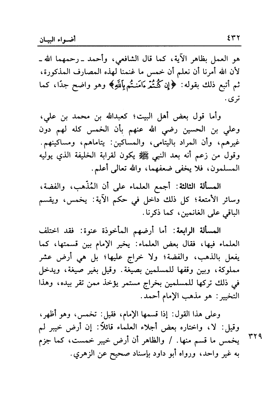 وأما قول بعض أهل البيت؛ كعبد الله بن محمد بن علي، وعلي بن الحسين رضي الله عنهم بأن الخمس كله لهم دون غيرهم، وأن المراد باليتامى، والمساكين: يتاماهم، ومساكينهم. وقول من زعم أنه بعد النَّبي - صلى الله عليه وسلم - يكون لقرابة الخليفة الذي يوليه المسلمون، فلا يخفى ضعفهما، والله تعالى أعلم.