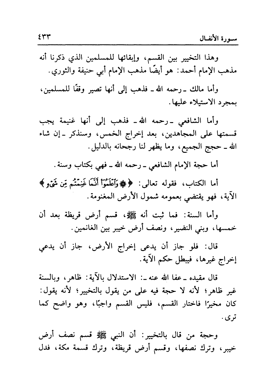 وهذا التخيير بين القسم، وإبقائها للمسلمين الذي ذكرنا أنه مذهب الإمام أحمد: هو أيضاً مذهب الإمام أبي حنيفة والثوري.
