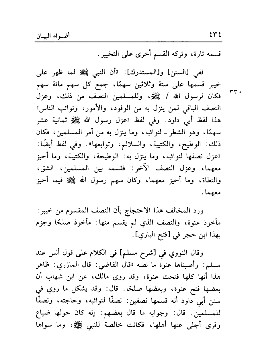 وقال النووي في [شرح مسلم] في الكلام على قول أنس عند مسلم: وأصبناها عنوة ما نصّه "قال القاضي: قال المازري: ظاهر هذا أنها كلها فتحت عنوة، وقد روى مالك، عن ابن شهاب أن بعضها فتح عنوة، وبعضها صلحاً. قال: وقد يشكل ما روي في سنن أبي داود أنه قسمها نصفين: نصفاً لنوائبه، وحاجته، ونصفاً للمسلمين. قال: وجوابه ما قال بعضهم: إنه كان حولها ضياع وقرى أجلى عنها أهلها، فكانت خالصة للنبي - صلى الله عليه وسلم -، وما سواها