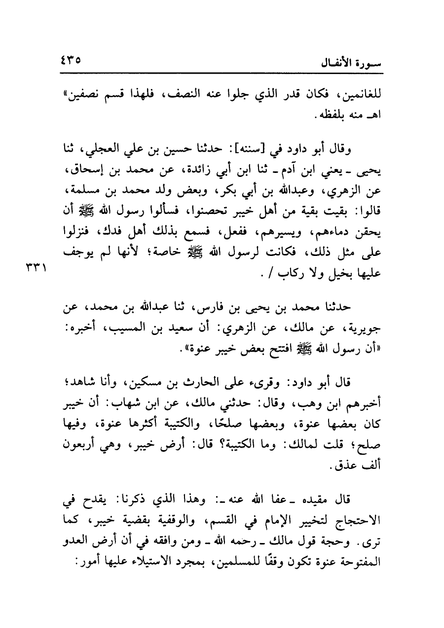 قال أبو داود: وقرىء على الحارث بن مسكين، وأنا شاهد، أخبرهم ابن وهب، وقال: حدثني مالك، عن ابن شهاب: أن خيبر كان بعضها عنوة، وبعضها صلحاً، والكتيبة أكثرها عنوة، وفيها صلح، قلت لمالك: وما الكتيبة؟ قال: أرض خيبر، وهي أربعون ألف عذق.