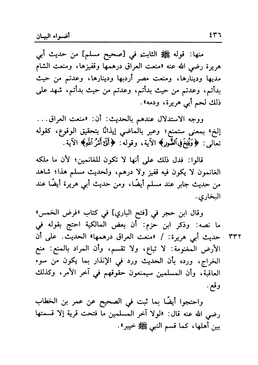 وقال ابن حجر في [فتح الباري] في كتاب "فرض الخمس" ما نصه: وذكر ابن حزم: أن بعض المالكية احتج بقوله في حديث أبي هريرة: "منعت العراق درهمها" الحديث. على أن الأرض المغنومة: لا تباع، ولا تقسم، وأن المراد بالمنع: منع الخراج، ورده بأن الحديث ورد في الإنذار بما يكون من سوء العاقبة، وأن المسلمين سيمنعون حقوقهم في آخر الأمر، وكذلك وقع.