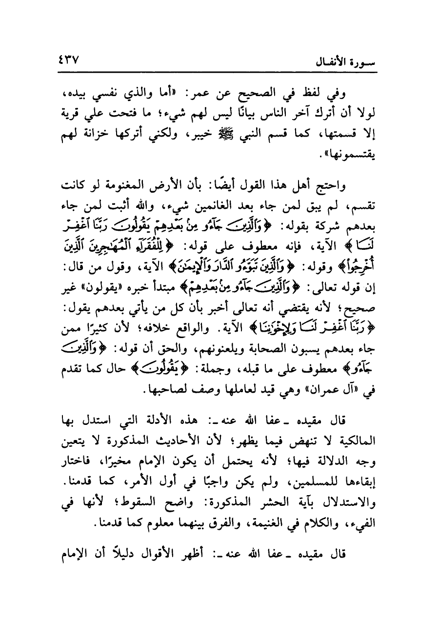 واحتج أهل هذا القول أيضاً: بأن الأرض المغنومة لو كانت تقسم، لم يبق لمن جاء بعد الغانمين شيء، والله أثبت لمن جاء بعدهم شركة بقوله: {وَالَّذِينَ جَاءُوا مِنْ بَعْدِهِمْ يَقُولُونَ رَبَّنَا اغْفِرْ لَنَا} الآية، فإنه معطوف على قوله: {لِلْفُقَرَاءِ الْمُهَاجِرِينَ الَّذِينَ أُخْرِجُوا} وقوله: {وَالَّذِينَ تَبَوَّءُوا الدَّارَ وَالْأِيمَانَ} الآية، وقول من قال: إن قوله تعالى: {وَالَّذِينَ جَاءُوا مِنْ بَعْدِهِمْ} مبتدأ خبره "يَقُولُونَ" غير صحيح؛ لأنه يقتضي أنه تعالى أخبر بأن كل من يأتي بعدهم يقول: {رَبَّنَا اغْفِرْ لَنَا وَلِإِخْوَانِنَا} الآية. والواقع خلافه؛ لأن كثيراً ممن جاء بعدهم يسبون الصحابة ويلعنونهم، والحق أن قوله: {وَالَّذِينَ جَاءُوا} معطوف على ما قبله، وجملة: {يَقُولُونَ} حال كما تقدم في "آل عمران" وهي قيد لعاملها وصف لصاحبها.