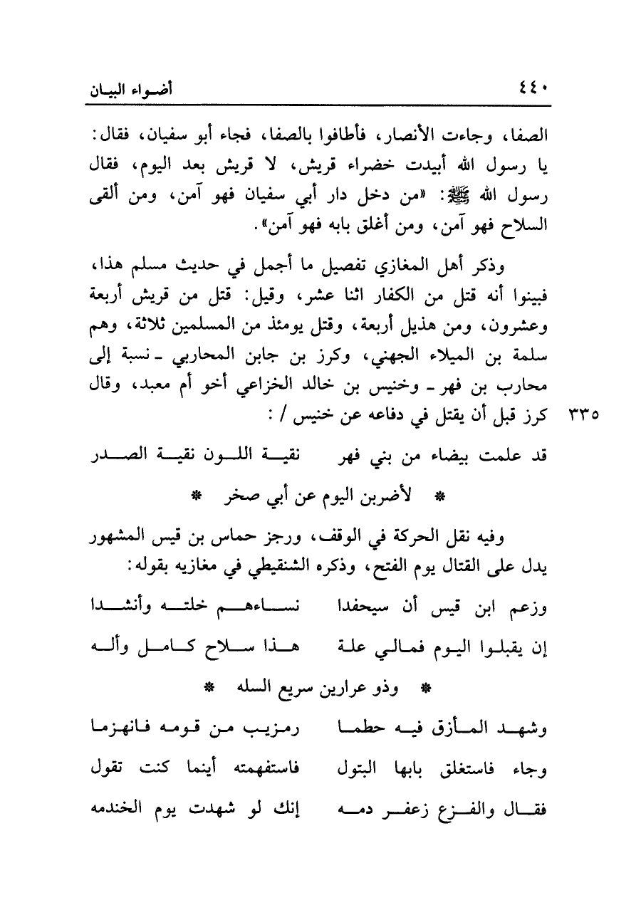 وفيه نقل الحركة في الوقف، ورجز حماس بن قيس المشهور يدل على القتال يوم الفتح، وذكره الشنقيطي في مغازيه بقوله: