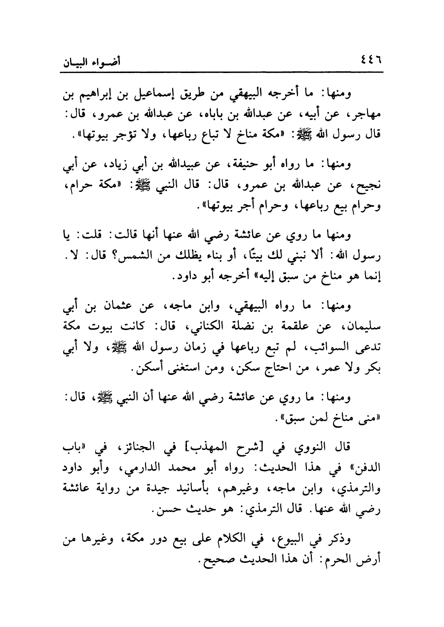 ومنها: ما رواه البيهقي، وابن ماجه، عن عثمان بن أبي سليمان، عن علقمة بن نضلة الكناني، قال: كانت بيوت مكة تدعى السوائب، لم تبع رباعها في زمان رسول الله - صلى الله عليه وسلم -، ولا أبي بكر ولا عمر، من احتاج سكن، ومن استغنى أسكن.