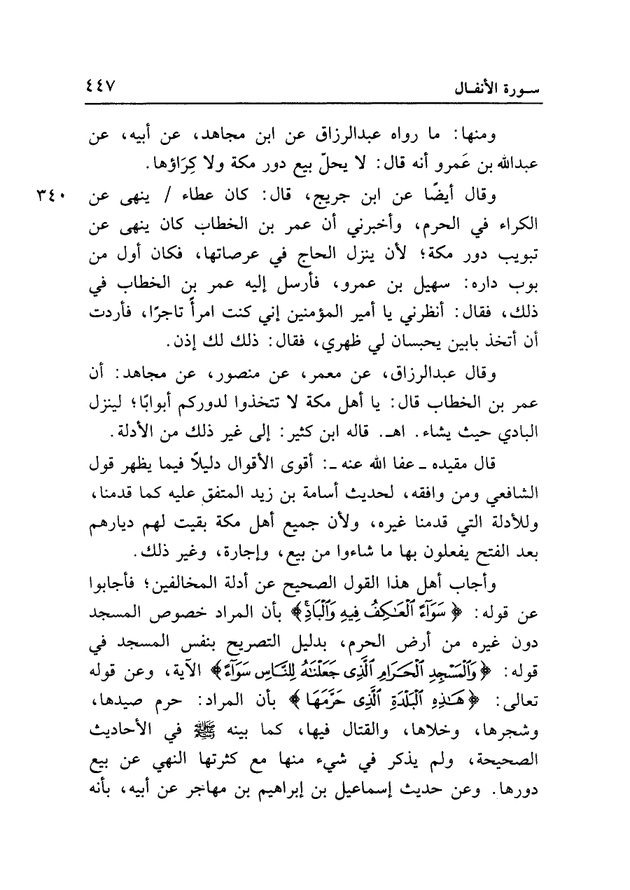 وقال عبد الرزاق، عن معمر، عن منصور، عن مجاهد: إن عمر بن الخطاب قال: يا أهل مكة لا تتخذوا لدوركم أبواباً؛ لينزل البادي حيث يشاء. اهـ. قاله ابن كثير: إلى غير ذلك من الأدلة.
