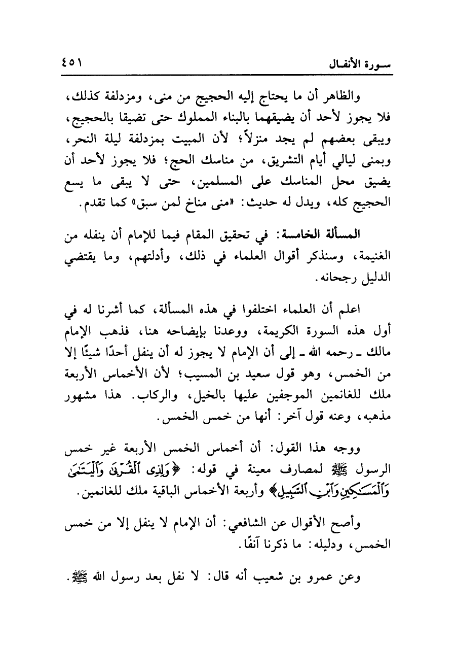 اعلم أن العلماء اختلفوا في هذه المسألة، كما أشرنا له في أول هذه السورة الكريمة، ووعدنا بإيضاحه هنا، فذهب الإمام مالك -رحمه الله- إلى أن الإمام لا يجوز له أن ينفل أحداً شيئاً إلا من الخمس، وهو قول سعيد بن المسيب؛ لأن الأخماس الأربعة ملك للغانمين الموجفين عليها بالخيل، والركاب. هذا مشهور مذهبه، وعنه قول آخر: أنها من خمس الخمس.