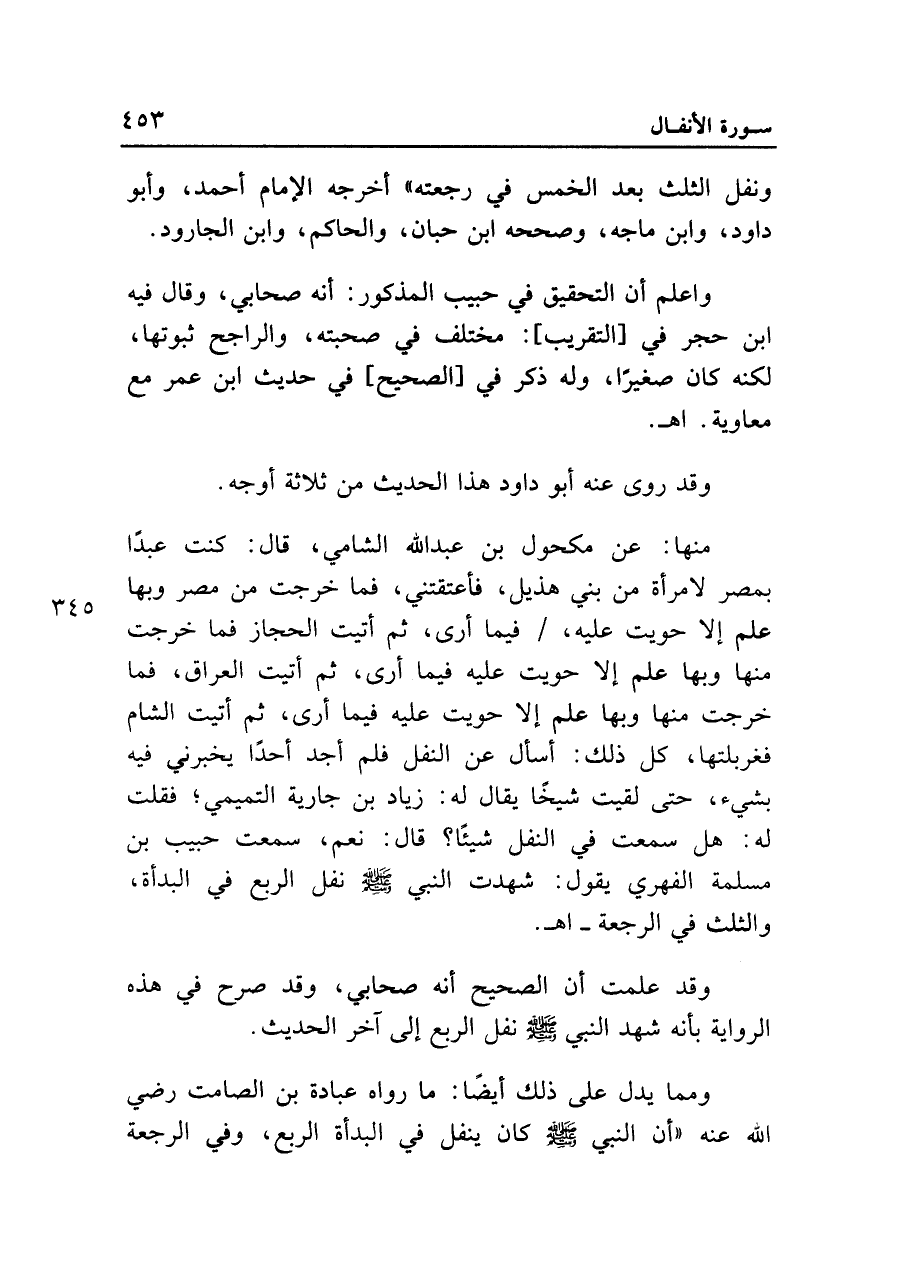 منها: عن مكحول بن عبد الله الشامي، قال: كنت عبداً بمصر لامرأة من بني هذيل، فأعتقتني، فما خرجت من مصر وبها علم إلا حويت عليه، فيما أرى، ثم أتيت الحجاز فما خرجت منها وبها علم إلا حويت عليه فيما أرى، ثم أتيت العراق، فما خرجت منها وبها علم إلا حويت عليه فيما أرى، ثم أتيت الشام فغربلتها، كل ذلك: أسأل عن النفل فلم أجد أحداً يخبرني فيه بشيء، حتى لقيت شيخاً يقال له: زياد بن جارية التميمي؛ فقلت له: هل سمعت في النفل شيئاً؟ قال: نعم، سمعت حبيب بن مسلمة الفهري يقول: شهدت النَّبي صلى الله عليه وسلم نفل الربع في البدأة، والثلث في الرجعة- اهـ.