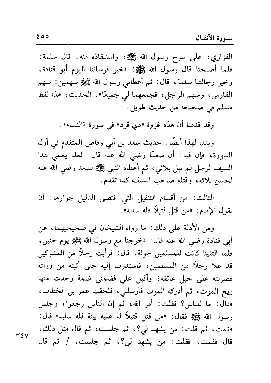 الثالث: من أقسام التنفيل التي اقتضى الدليل جوازها: أن يقول الإمام: "من قتل قتيلاً فله سلبه".