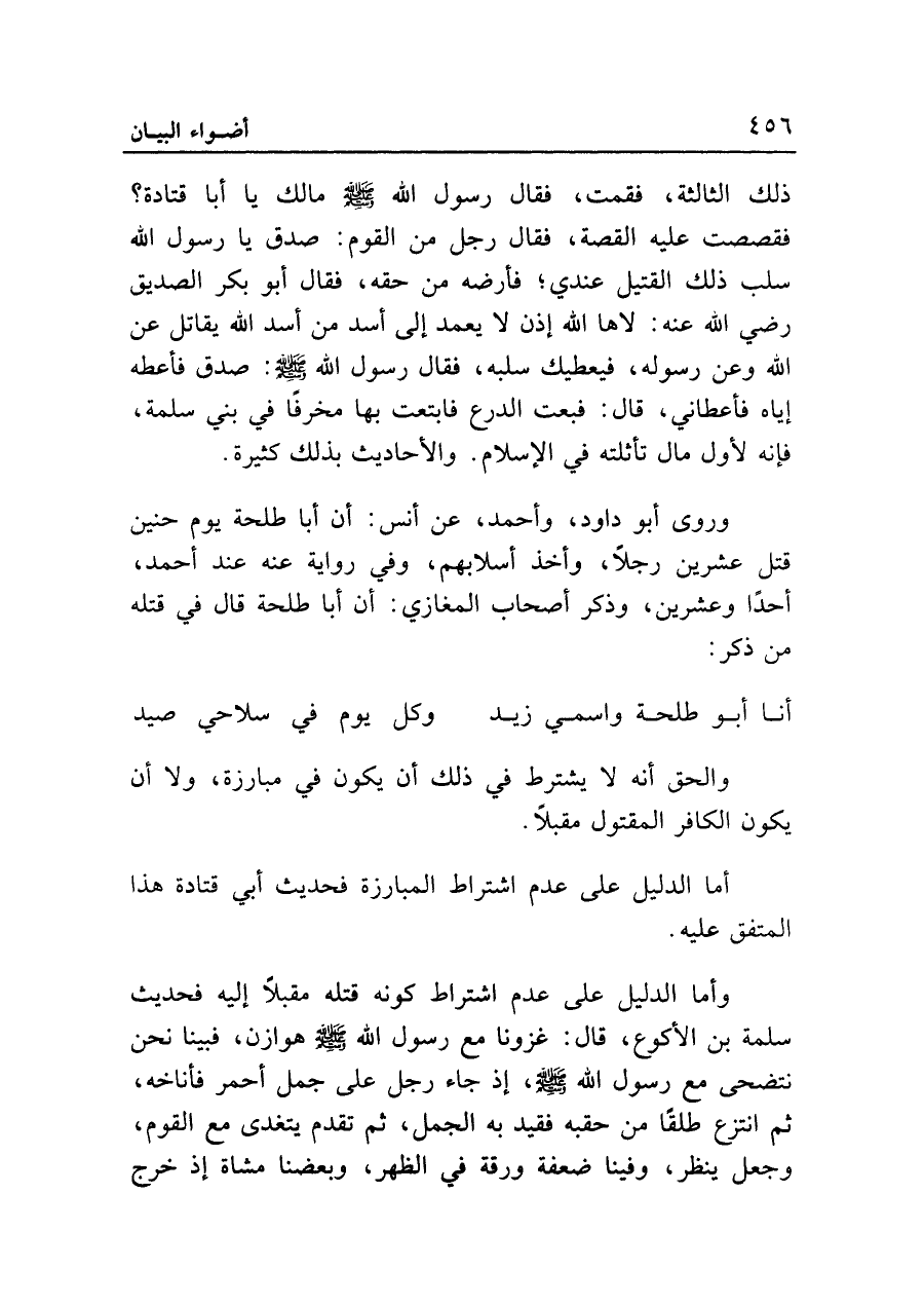 ذلك الثالثة، فقمت، فقال رسول الله صلى الله عليه وسلم ما لك يا أبا قتادة؟ فقصصت عليه القصة، فقال رجل من القوم: صدق يا رسول الله سلب ذلك القتيل عندي؛ فأرضه من حقه، فقال أبو بكر الصديق رضي الله عنه: لاها الله إذن لا يعمد إلى أسد من أسد الله يقاتل عن الله وعن رسوله، فيعطيك سلبه، فقال رسول الله صلى الله عليه وسلم : صدق فأعطه إياه فأعطاني، قال: فبعت الدرع فابتعت بها مخرفاً في بني سلمة، فإنه لأول مال تأثلته في الإسلام. والأحاديث بذلك كثيرة.