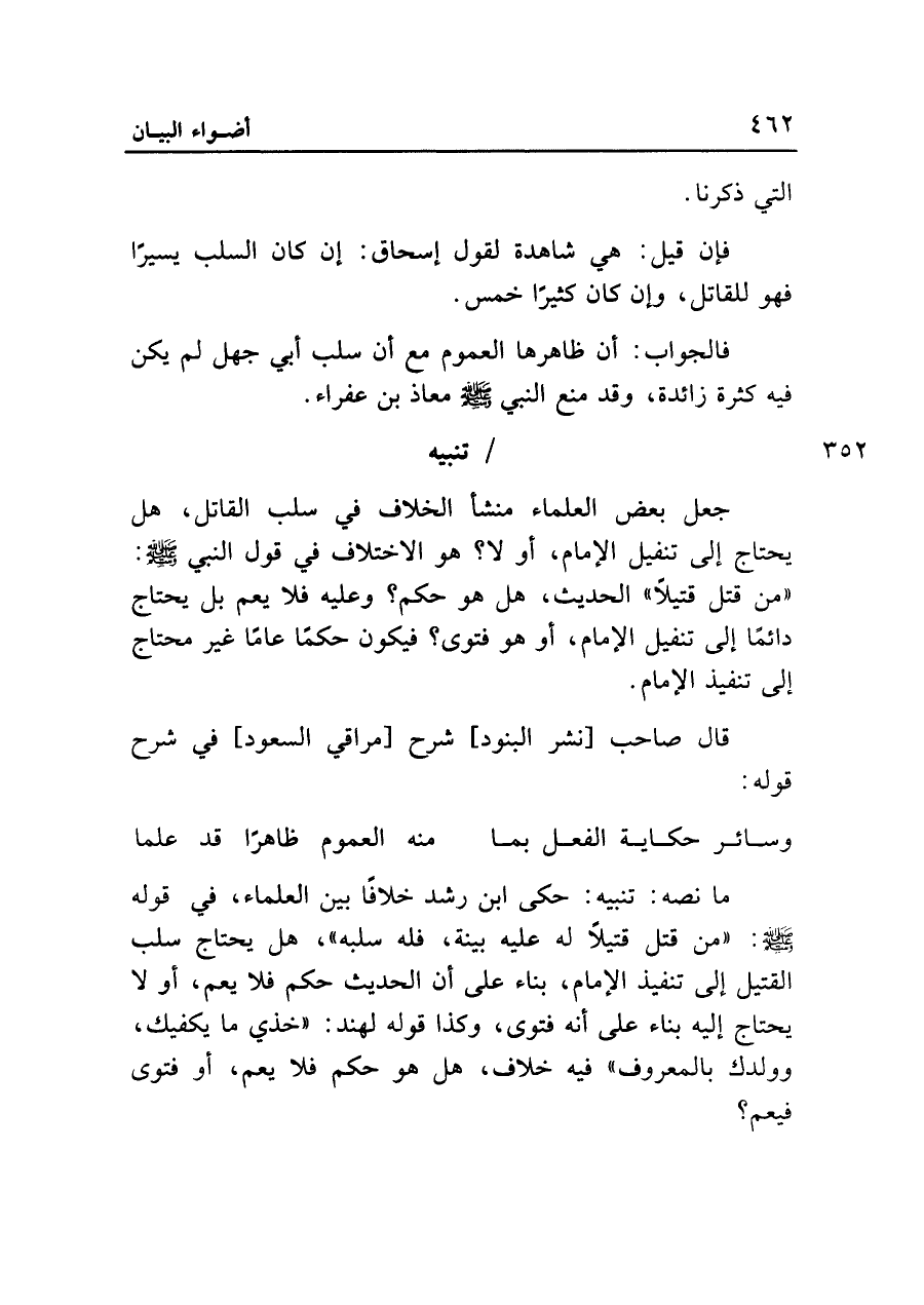 ما نصه: تنبيه: حكى ابن رشد خلافًا بين العلماء، في قوله - صلى الله عليه وسلم -: "من قتل قتيلًا له عليه بينة، فله سلبه"، هل يحتاج سلب القتيل إلى تنفيذ الإمام، بناء على أن الحديث حكم فلا يعم، أو لا يحتاج إليه بناء على أنه فتوى، وكذا قوله لهند: "خذي ما يكفيك، وولدك بالمعروف" فيه خلاف، هل هو حكم فلا يعم، أو فتوى فيعم؟