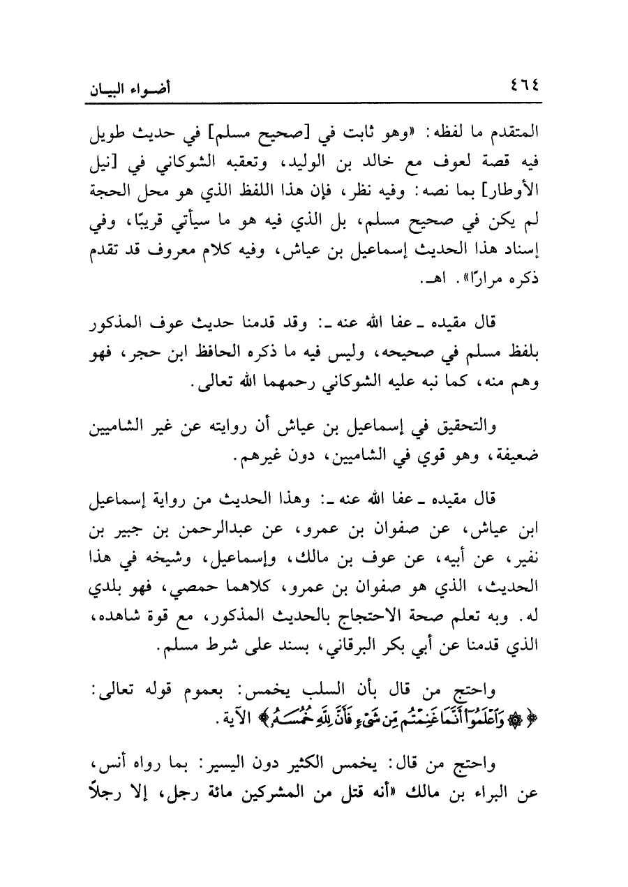 قال مقيده -عفا الله عنه-: وهذا الحديث من رواية إسماعيل بن عياش، عن صفوان بن عمرو، عن عبد الرحمن بن جبير بن نفير، عن أبيه، عن عوف بن مالك، وإسماعيل، وشيخه في هذا الحديث، الذي هو صفوان بن عمرو، كلاهما حمصي، فهو بلدي له. وبه تعلم صحة الاحتجاج بالحديث المذكور، مع قوة شاهده، الذي قدمنا عن أبي بكر البرقاني، بسند على شرط مسلم.