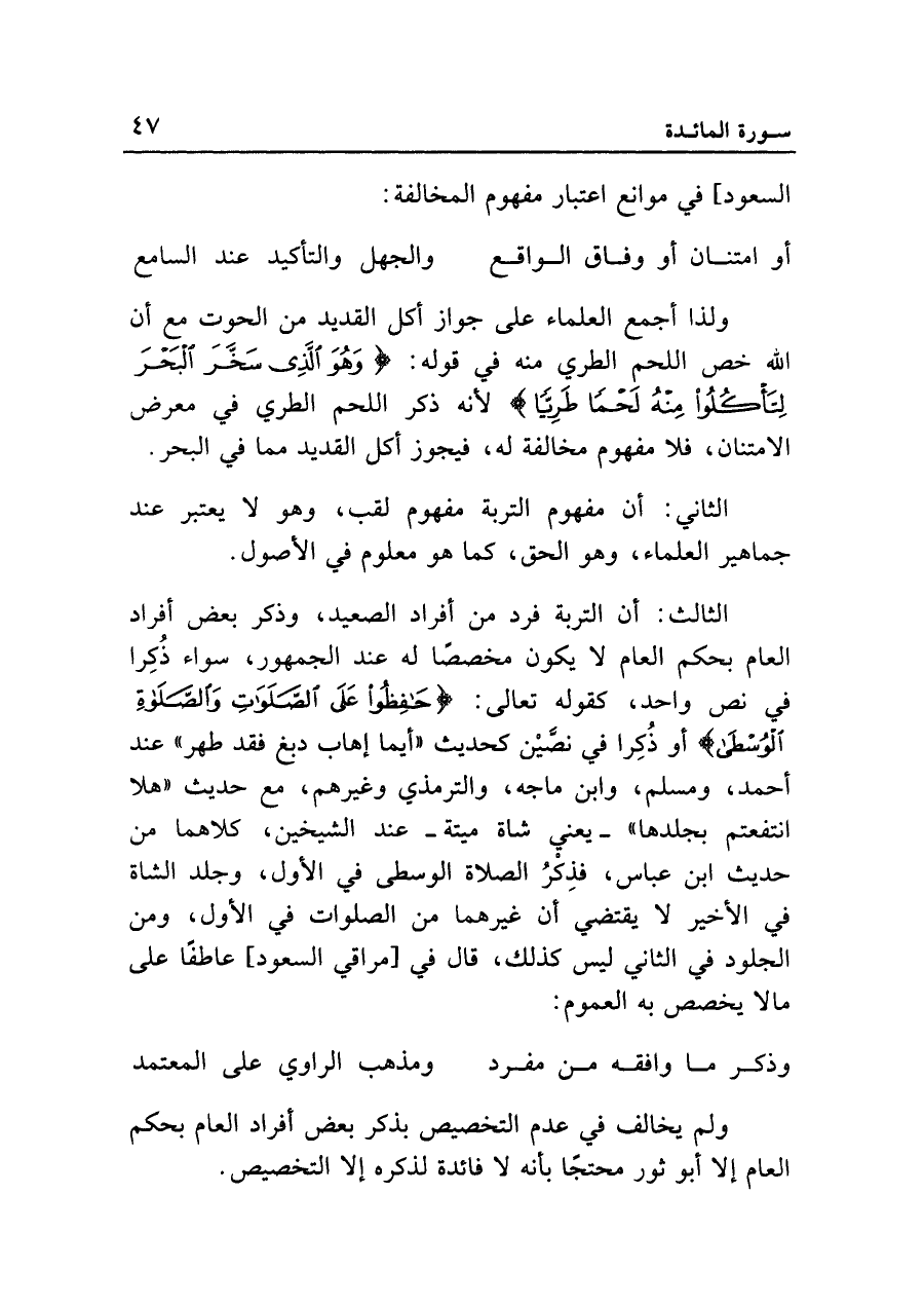 الثالث: أن التربة فرد من أفراد الصعيد، وذكر بعض أفراد العام بحكم العام لا يكون مخصصاً له عند الجمهور، سواء ذكرا في نص واحد، كقوله تعالى: {حَافِظُوا عَلَى الصَّلَوَاتِ وَالصَّلاةِ الْوُسْطَى} أو ذكرا في نصين كحديث "أيما إهاب دبغ فقد طهر" عند أحمد، ومسلم، وابن ماجه، والترمذي وغيرهم، مع حديث "هلا انتفعتم بجلدها" -يعني شاة ميتة- عند الشيخين، كلاهما من حديث ابن عباس، فذكر الصلاة الوسطى في الأول، وجلد الشاة في الأخير لا يقتضي أن غيرهما من الصلوات في الأول، ومن الجلود في الثاني ليس كذلك، قال في [مراقي السعود] عاطفاً على ما لا يخصص به العموم: