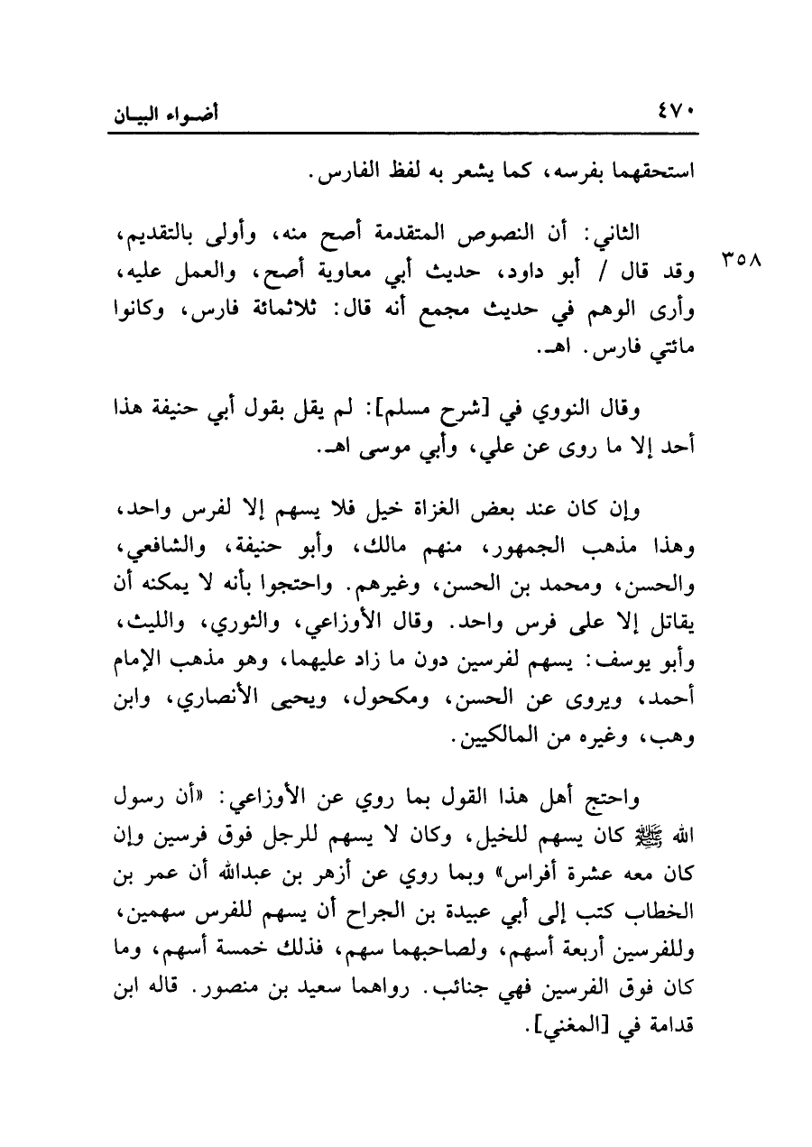 الثاني: أن النصوص المتقدمة أصح منه، وأولى بالتقديم، وقد قال أبو داود، حديث أبي معاوية أصح، والعمل عليه، وأرى الوهم في حديث مجمع أنه قال: ثلاثمائة فارس، وكانوا مائتي فارس. اهـ.