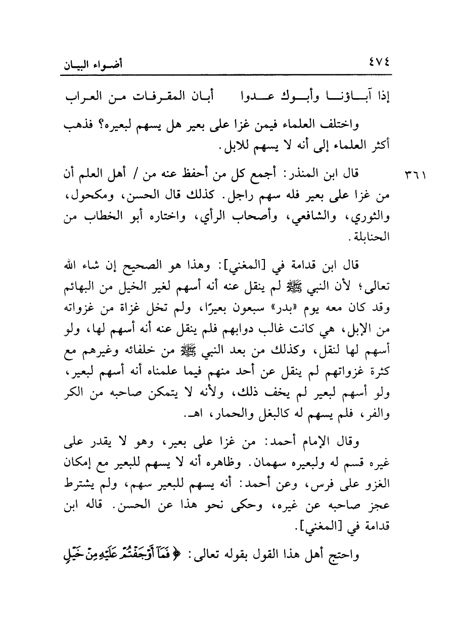 قال ابن قدامة في [المغني]: وهذا هو الصحيح إن شاء الله تعالى؛ لأن النبي صلى الله عليه وسلم لم ينقل عنه أنه أسهم لغير الخيل من البهائم وقد كان معه يوم "بدر" سبعون بعيرًا، ولم تخل غزاة من غزواته من الإبل، هي كانت غالب دوابهم فلم ينقل عنه أنه أسهم لها، ولو أسهم لها لنقل، وكذلك من بعد النبي صلى الله عليه وسلم من خلفائه وغيرهم مع كثرة غزواتهم لم ينقل عن أحد منهم فيما علمناه أنه أسهم لبعير، ولو أسهم لبعير لم يخف ذلك، ولأنه لا يتمكن صاحبه من الكر والفر، فلم يسهم له كالبغل والحمار، اهـ.
